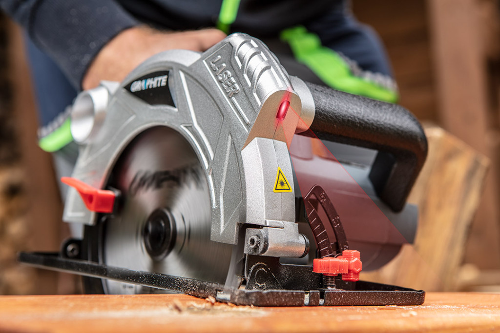 GRAPHITE körfűrész, motor teljesítmény 1800W, 5000/min. fordulatszám. A gép alkalmas a 210 mm külső átmérőjű tárcsákkal való működtetésre és lehetővé teszi max. 73 mm vastagságú anyagok vágását. Szintén lehetőség van max. 45° szögben vágni. A dőlésszög állítása és a vágási mélység szabályozása a szerszám használata nélkül történik - a vágási paraméterek beállítását segíti a speciális skála. Az felhasználó biztonságára a véletlen elindítás ellen védő biztonsági kapcsoló ügyel. A gép kényelmes és biztos vezetését a széles fogási felületű legömbölyített segédmarkolat biztosítja. A felhasználó számára látható helyen kapott helyet az elektromos szerszám hálózatra csatlakoztatását és a készenlétet jelző kiejlző. A tárcsa fő védőlemeze alumínium ötvözetből készült. A berendezéssel integrált lézeres mutató megkönnyíti a vágás irányának kijelölését. A felszereléshez tartozó párhuzamos vezetősín lehetővé teszi a körfűrész precíz vezetését az anyag széle mentén.Kézi körfűrész 1800W, tárcsa 210x30 mm, fordulatszám 5000 min⁻¹, ferde vágás 0-45º , vágási mélység 73/49 mm (90º/45º ), lézer <1 mW, tömege 5.5 kg, mélység és vágási szög szabályozás, tartozék: párhuzamos vezető sín