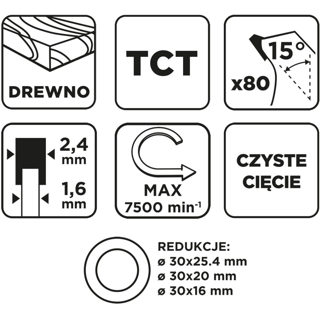 Fűrészlap, 230 x 30 mm, 80 db vídia foggal, 57T229, GRAPHITE, 230 mm külső átmérővel és 30 mm átmérőjű rögzítőfurattal. 80 foggal rendelkezik, a vágási szélessége 2,4 mm, a fogszög 15°. A maximális fordulatszám 7500 fordulat/perc. Gyors vágási típus jellemzi. A fűrészlap megfelel az EN 847-1 szabványnak, és 30/25,4 mm-es, 30/20 mm-es és 30/16 mm-es redukciós gyűrűket tartalmaz. A GRAPHITE márkájú fűrészlapot fa és faalapú anyagok, például rétegelt lemez, forgácslap és MDF vágására tervezték. A csomagban található redukciós gyűrűk lehetővé teszik, hogy a fűrészlap a legtöbb fűrészmodellel használható legyen.