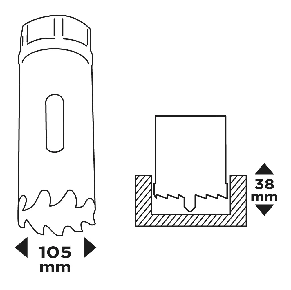 A GRAPHITE 105 mm-es, 44 mm magas 56T720 bimetál lyukfűrészével 38 mm mélységig lehet fúrni. HSS nagysebességű acélból készül, és 5/8'' x 18 UNF menettel van felszerelve. Fémben, rozsdamentes acélban (Inox), öntöttvasban, sárgarézben, alumíniumban és fában való munkához tervezték. A GRAPHITE lyukfűrészt a 32-152 mm-es tartományban lévő bimetál lyukfűrészekhez ajánlott az 56T754 adapterrel és a kísérleti fúrószárral együtt használni. A szerszám maximális fordulatszáma az anyagtól függően változik: acél - 80 fordulat/perc, Inox acél - 40 fordulat/perc, alumínium - 120 fordulat/perc, fa - 100 fordulat/perc, öntöttvas - 55 fordulat/perc, sárgaréz - 110 fordulat/perc. A bimetál lyukfűrészt fúrógép vagy csavarozógép segítségével történő használatra tervezték.