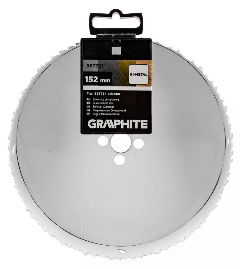 A 44 mm-es magasságú, 152 mm-es GRAPHITE 56T721 bimetál lyukfűrész 38 mm mélységig történő fúrást tesz lehetővé. HSS nagysebességű acélból készül, és 5/8'' x 18 UNF menettel van ellátva. Fém, rozsdamentes acél (Inox), öntöttvas, sárgaréz, alumínium és fa megmunkálására tervezték. A GRAPHITE lyukfűrészt a 32-152 mm-es tartományban lévő bimetál lyukfűrészekhez ajánlott az 56T754 adapterrel és a kísérleti fúrószárral együtt használni. A szerszám maximális fordulatszáma az anyagtól függően változik: acél - 55 fordulat/perc, Inox acél - 25 fordulat/perc, alumínium - 85 fordulat/perc, fa - 75 fordulat/perc, öntöttvas - 35 fordulat/perc, sárgaréz - 75 fordulat/perc. A bimetál lyukfűrészt fúrógép vagy csavarozógép segítségével történő használatra tervezték.