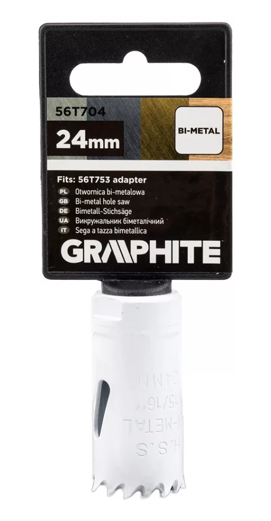 A GRAPHITE 56T704 24 mm-es, bimetálból készült 24 mm-es lyukfűrésze 51 mm-es magasságával 38 mm mélységig fúrható. HSS nagysebességű acélból készül, és 1/2'' x 20 UNF menettel van ellátva. Fémben, rozsdamentes acélban (Inox), öntöttvasban, sárgarézben, alumíniumban és fában való munkára tervezték. A GRAPHITE lyukfűrészt a 14-30 mm-es tartományban lévő bimetál lyukfűrészekhez ajánlott a 56T753 adapterrel és a kísérleti fúrószárral együtt használni. A szerszám maximális fordulatszáma az anyagtól függően változik: acél - 370 fordulat/perc, Inox acél - 185 fordulat/perc, alumínium - 555 fordulat/perc, fa - 500 fordulat/perc, öntöttvas - 245 fordulat/perc, sárgaréz - 495 fordulat/perc. A bimetál lyukfűrészt fúrógép vagy csavarozógép segítségével történő használatra tervezték.