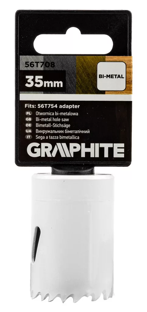 A GRAPHITE 56T708 35 mm-es bimetál lyukfűrésze 51 mm-es magasságával 38 mm mélységig fúrható. HSS nagysebességű acélból készül, és 5/8'' x 18 UNF menettel van ellátva. Fémben, rozsdamentes acélban (Inox), öntöttvasban, sárgarézben, alumíniumban és fában való munkára tervezték. A GRAPHITE lyukfűrészt a 32-152 mm-es tartományban lévő bimetál lyukfűrészekhez ajánlott az 56T754 adapterrel és a kísérleti fúrószárral együtt használni. A szerszám maximális fordulatszáma az anyagtól függően változik: acél - 250 fordulat/perc, Inox acél - 125 fordulat/perc, alumínium - 375 fordulat/perc, fa - 310 fordulat/perc, öntöttvas - 165 fordulat/perc, sárgaréz - 330 fordulat/perc. A bimetál lyukfűrészt fúrógép vagy csavarozógép segítségével történő használatra tervezték.