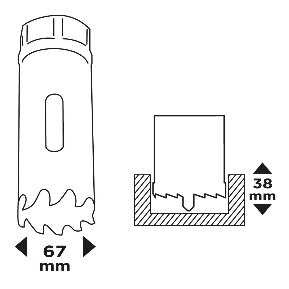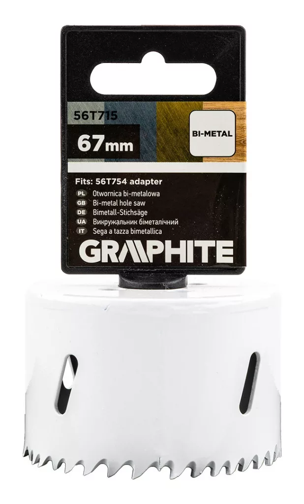 A GRAPHITE 67 mm-es 56T715 bimetál lyukfűrész 44 mm magassággal 38 mm mélységig fúrást tesz lehetővé. HSS nagysebességű acélból készül, és 5/8'' x 18 UNF menettel van ellátva. Fémben, rozsdamentes acélban (Inox), öntöttvasban, sárgarézben, alumíniumban és fában történő munkához tervezték. A GRAPHITE lyukfűrészt a 32-152 mm-es tartományban lévő bimetál lyukfűrészekhez ajánlott az 56T754 adapterrel és a kísérleti fúrószárral együtt használni. A szerszám maximális fordulatszáma az anyagtól függően változik: acél - 130 fordulat/perc, Inox acél - 65 fordulat/perc, alumínium - 195 fordulat/perc, fa - 170 fordulat/perc, öntöttvas - 85 fordulat/perc, sárgaréz - 170 fordulat/perc. A bimetál lyukfűrészt fúrógép vagy csavarozógép segítségével történő használatra tervezték.