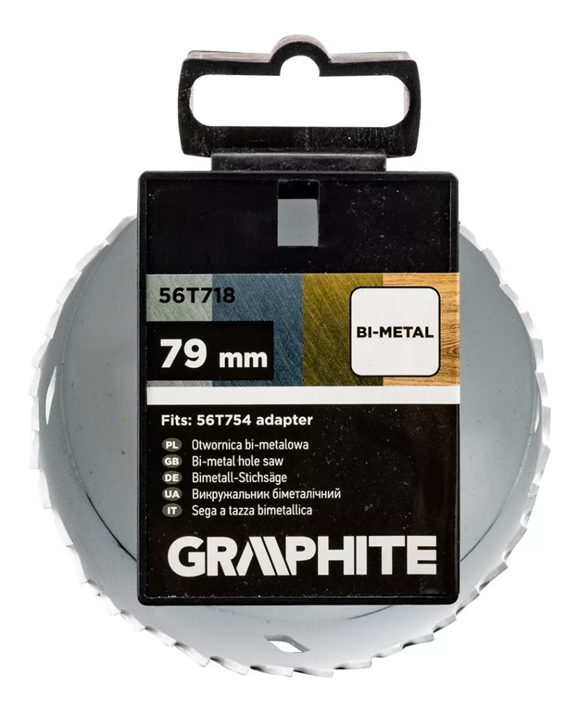 A GRAPHITE 56T718 79 mm-es, 44 mm magas, bifém lyukfűrészével 38 mm mélységig lehet fúrni. HSS nagysebességű acélból készül, és 5/8'' x 18 UNF menettel van ellátva. Fém, rozsdamentes acél (Inox), öntöttvas, sárgaréz, alumínium és fa megmunkálására tervezték. A GRAPHITE lyukfűrészt a 32-152 mm-es tartományban lévő bimetál lyukfűrészekhez ajánlott az 56T754 adapterrel és a kísérleti fúrószárral együtt használni. A szerszám maximális fordulatszáma az anyagtól függően változik: acél - 110 fordulat/perc, Inox acél - 55 fordulat/perc, alumínium - 165 fordulat/perc, fa - 150 fordulat/perc, öntöttvas - 70 fordulat/perc, sárgaréz - 140 fordulat/perc. A bimetál lyukfűrészt fúrógép vagy csavarozógép segítségével történő használatra tervezték.