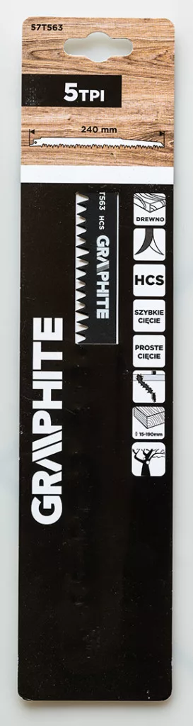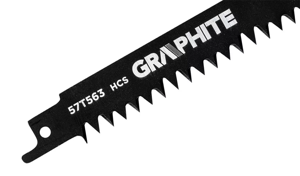 A GRAPHITE HCS 240 x 19 x 1,5 mm, 5 TPI, 57T563 szablyafűrészlapja szénacél (HCS), amelynek teljes hossza 240 mm, szélessége 19 mm és vastagsága 1,5 mm. 5 fog per hüvelyk (TPI) és 5 mm-es fogközzel rendelkezik. A 15-190 mm átmérőjű durva, szög nélküli fa és tűzifa egyenes vágására, valamint <190 mm átmérőjű zöld fa vágására tervezték. A GRAPHITE penge kialakítása gyors és durva vágást tesz lehetővé.