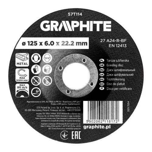 Csiszolótárcsa, korund fémhez 125 x 6 x 22,2 mm, 27 A24-R-BF, domború 57T114 a GRAPHITE által megjelölt 27 A24-R-BF típus egy domború szerszám, amelyet fém csiszolásához terveztek. Átmérője 125 mm, vastagsága 6 mm, rögzítőfurata 22,2 mm. A maximális fordulatszám 12 200 fordulat/perc - 80 m/s egyidejű munkasebességgel. A termék megfelel az EN 12413 szabvány követelményeinek, így biztosítva a biztonságot és a minőségi munkavégzést. A GRAPHITE márkájú csiszolókorong alkalmas lesz fémmegmunkáláshoz, műhelymunkákhoz.