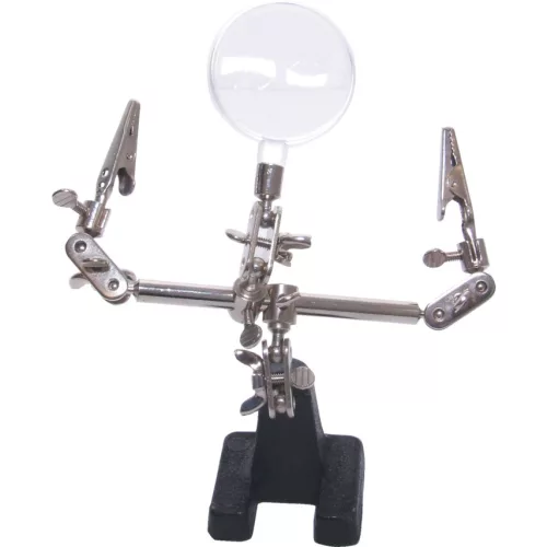 Ideális segédeszköz precíziós forrasztáshoz modellkészítéshez stb Az univerzális állíthatóságot 10 mozgatható csatlakozás segíti elő 50 mm átmérőjű 2 5 x nagyító Két rugóterhelésű krokodilcsipesz 8 mm vastagságú tárgyak befogásához Stabil tömör öntöttvas talp Az összes többi fémalkatrész krómozott és korrózióálló