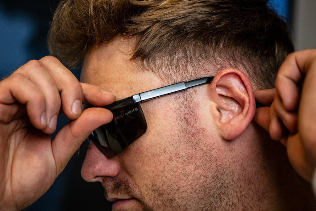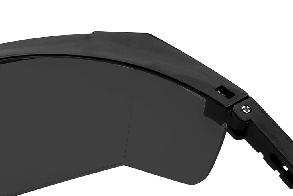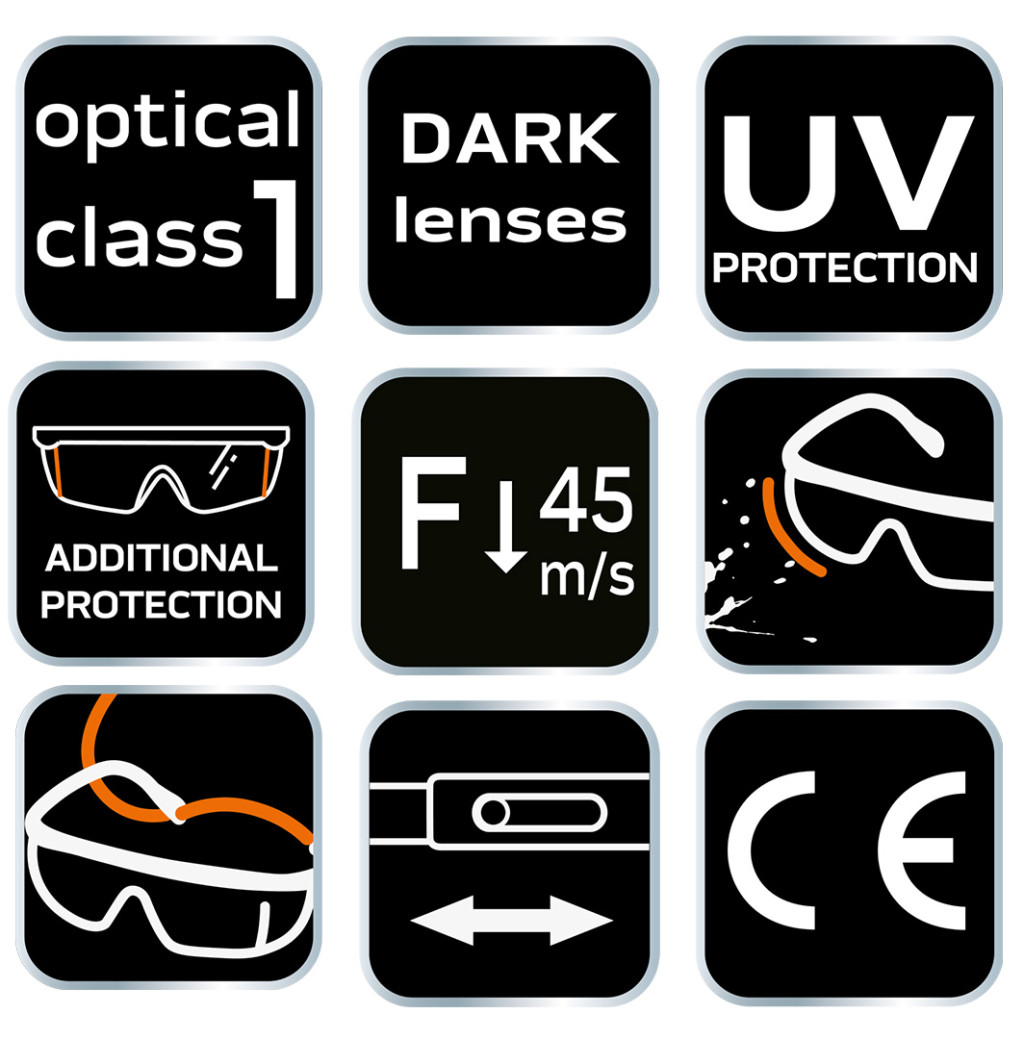 A NEO 97-507 típusú, sötétített lencséjű, állítható szárú védőszemüveg a II. védőkategóriába tartozik. Alacsony fényáteresztő képességű sötét üveggel és fekete kerettel rendelkeznek. A keretek tartós polikarbonátból készülnek. Az üvegek mechanikai szilárdsága F (45 m/s). Állítható halántékkal rendelkeznek, a végén lyukkal, amelyhez egy zsinór csatlakoztatható. A szűrő véd az ultraibolya fénytől, és hozzájárul a szem további biztonságához. A védőszemüveg az 1. optikai osztályba tartozik, és megfelel az EN166 EN170 EN172 szabvány követelményeinek is. Az oldalán lévő kiegészítő pajzs megakadályozza a különböző szögekből érkező részecskék bejutását. A védőszemüveg megvédi a szemet a portól és az irritációtól. Hasznosak csiszoláskor, fúráskor, véséskor, festéskor vagy fűnyíráskor.
