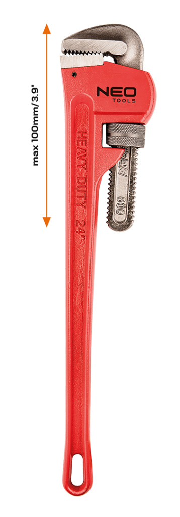 NEO "Stillson" csőfogó 600mm. A pofák belső oldalának recézettsége jó fogást biztosít a kör keresztmetszetű csöveken. A szilárd, széles keresztmetszetű, edzett pofák lehetővé teszik az alkalmazott forgatónyomaték megnövelését. A NEO márka a professzionális igényeket is kielégíti.