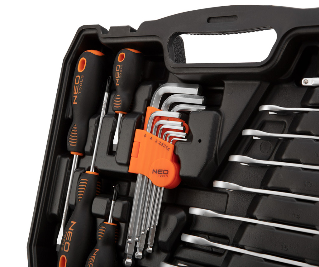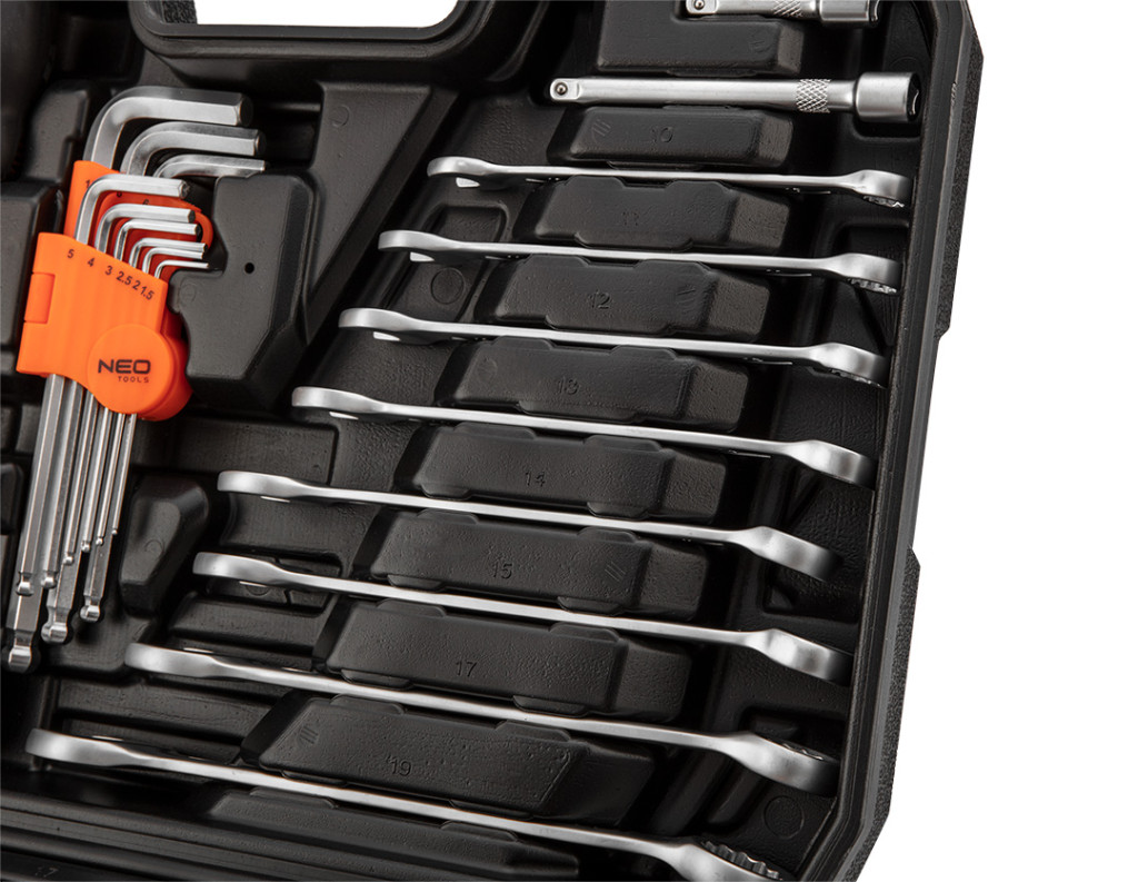 A NEO kulcskészlet 100 darabból áll, kiváló minőségű króm-vanádium acélból. A készlet két racsnis kulcsot tartalmaz, amelyek tartós racsnis mechanizmussal (72 fogú) és ergonomikus fogantyúval vannak felszerelve. A készlet tartalmaz 1/2"-os dugókulcsokat (10 és 27 mm közötti méretben), 1/4"-os dugókulcsokat (4 és 14 mm közötti méretben) és 1/4"-os csavarhúzóhegyeket (lapos, Phillips, hexa, Torx). Ezt egészíti ki a 9 db hatlapos kulcs, gyertyakulcsok, hosszabbítók, csuklók, adapterek, csavarhúzók és egy kombinált kulcskészlet. Az egész készletet egy praktikus és robusztus műanyag tokban szállítjuk. A termék megbízhatóságát a 25 év törésgarancia igazolja.