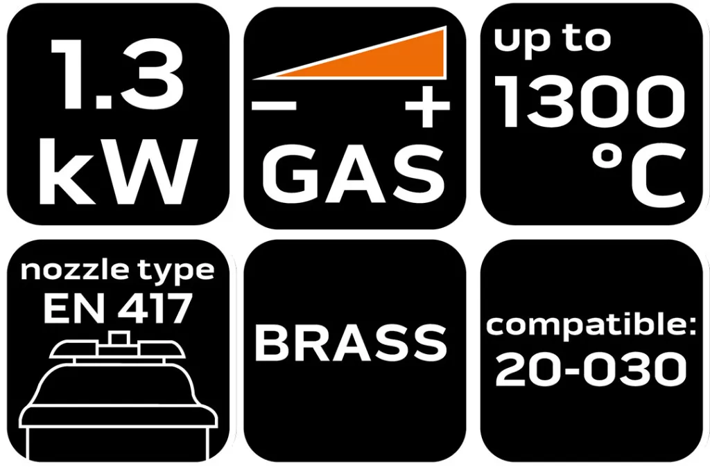 NEO 20-029 Gázégőfej menetes, réz, gázszabályzó csappal és lángterelő gyűrűvel. Egy gázforrasztó fej, amelyet alacsony üzemanyag-fogyasztás - 94,5 g/h - jellemez. A 227 g-os patronokhoz igazított, EN 417 típusú foglalattal rendelkező készülék akár 1300°C-os üzemi hőmérsékletet is elér. Sárgaréz lángszabályozó gyűrűjével és sárgaréz házával kiemelkedik tartósságával és hatékonyságával. Működési teljesítménye 1,3 kW. A barkácsfeladatoknál és a professzionális alkalmazásokban egyaránt bizonyítani fogja létjogosultságát.