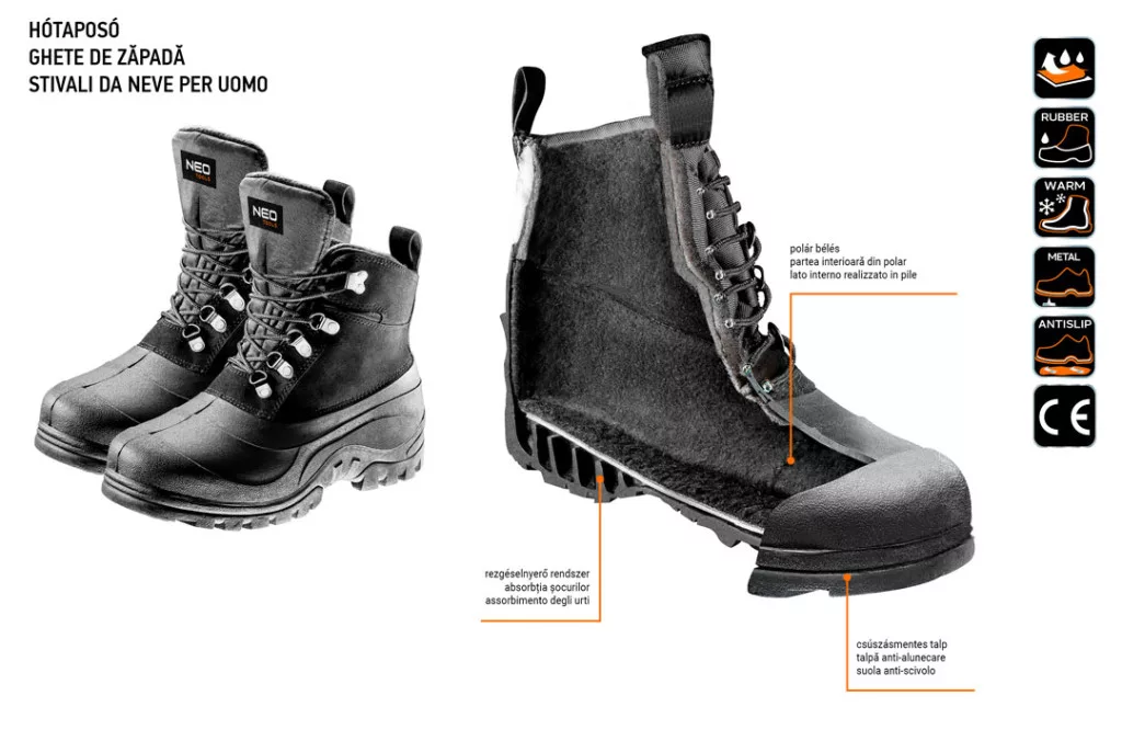 NEO Férfi téli munkabakancs-hótaposó nélkülözhetetlen felszerelés a téli szabadban végzett munkáknál. Az ökobőr és a kimagasló minőségű TPR gumi öntött talp garantálják a hő és a víz elleni védelmet. A meleg bélés biztosítja a felhasználó termikus komfortját, míg a csúszásgátló talp növeli a csúszós talajon a biztonságot. A NEO márka a professzionális igényeket is kielégíti.