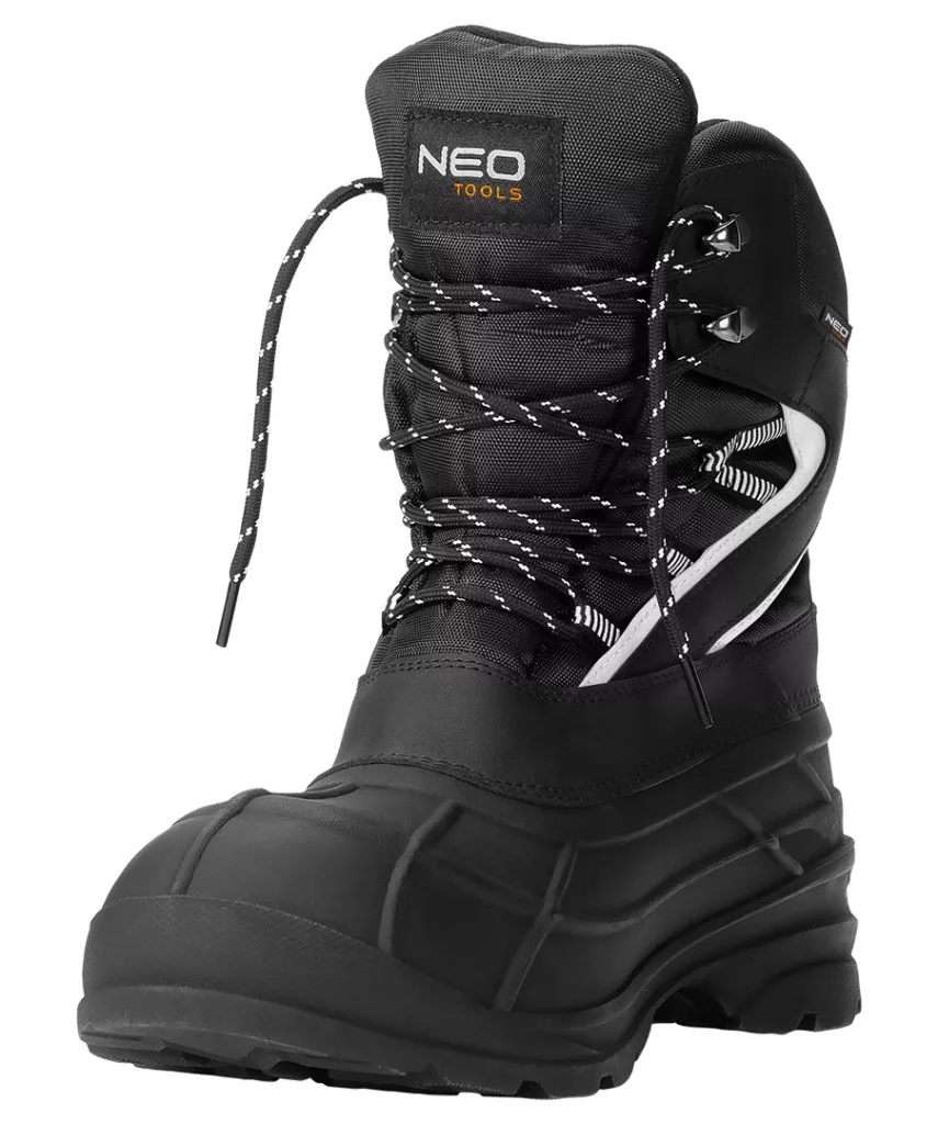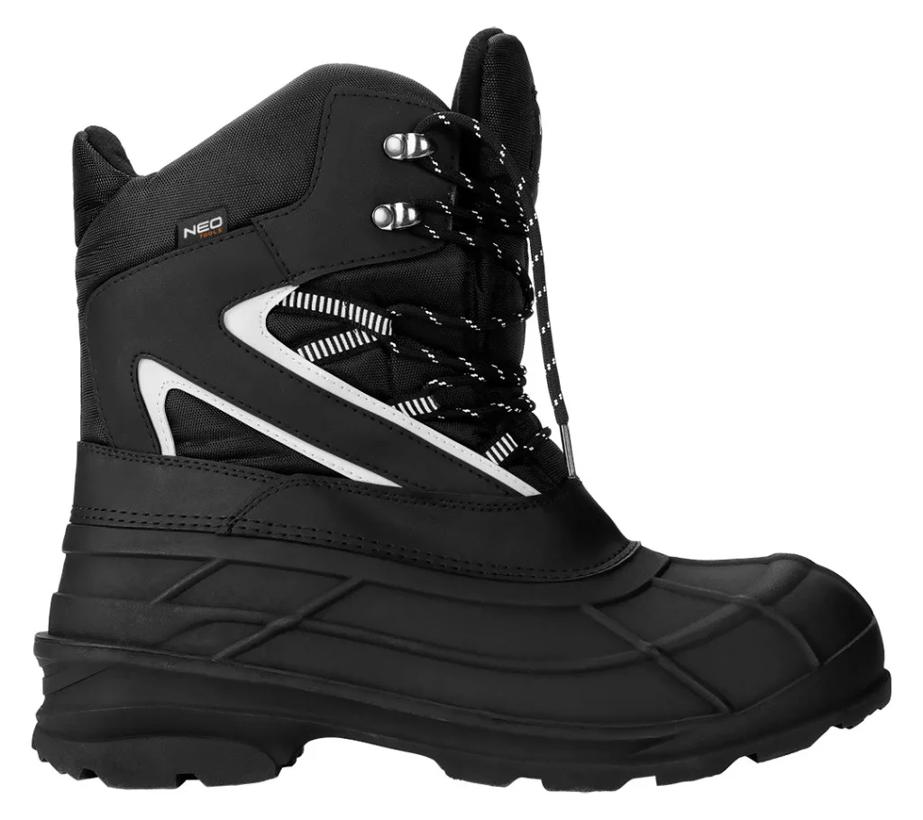 Férfi hótaposó bakancs fényvisszaverővel, ökológiai bőrből, poliészter szövetből és TPR gumiból készült lábbeli. A hótaposó csizma szigetelt és ellenáll a mínuszoknak. Praktikus fényvisszaverőkkel rendelkezik a sötétedés utáni vagy rosszul megvilágított területeken való láthatóság érdekében. Erős és tartós, fényvisszaverő csíkokkal ellátott fűzővel feltűnő megjelenése van, és kényelmes fel- és levételt biztosít. A NEO márkájú hótaposó bakancs ellenáll a hónak és a víznek. A csúszásmentes talp gondoskodik a biztonságról jeges felületeken. A bakancs javítja a téli munkavégzés kényelmét. Hasznos lesz például a járda hóeltakarításakor és minden téli munka számára.