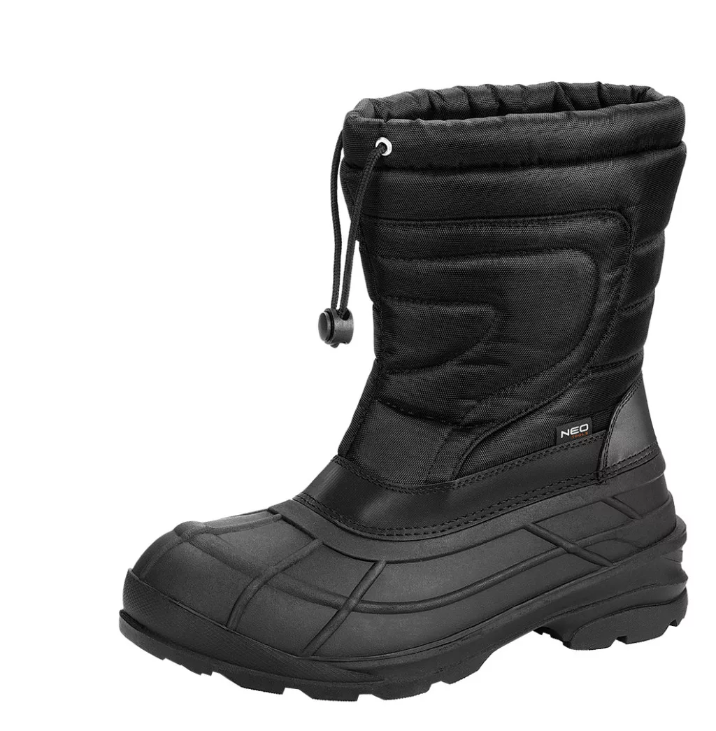 Férfi hótaposó csizma, összehúzható szárral, poliészter szövetből és TPR gumiból készült lábbeli. A hótaposó csizma szigetelt és ellenáll a fagynak is. Speciális kialakításuknak köszönhetően lehetővé teszi, hogy a lábfej simán belecsússzon a cipőbe. Felső része húzózsinórral ellátott, amely lehetővé teszi a méret kényelmes beállítását. A NEO hótaposó csizmák ellenállnak a hónak és a víznek. A csúszásmentes talp biztonságot nyújt a jeges felületeken. A csizma javítja a téli munkavégzés kényelmét. Hasznos lesz például a hó eltakarításakor a járdáról és minden téli munka elvégzéséhez.