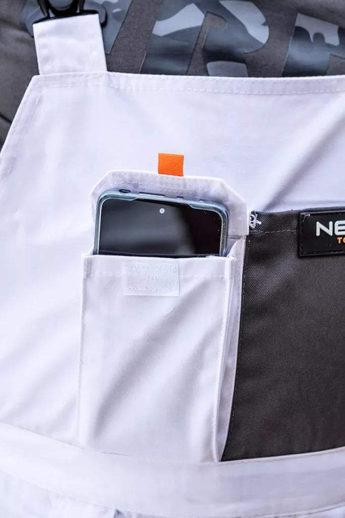 A NEO fehér kantáros munkanadrág kiváló minőségű anyagból készül, a kopásnak kitett helyeken meg van erősítve. A tartósságot a tripla varrások növelik és van rajta a térdvédőknek kialakított zseb is. A kialakított zsebekben elférnek a szükséges szerszámok, a kantárnak köszönhetően még a nagy terhelés sem okoz kényelmetlenséget munka közben. A nadrágon található okostelefonnak kialakított zseb – nagyobb méretű a korábbiaknál, hogy elférjenek benne a nagyobb kijelzős modellek is. A termék EN ISO 13688:2013 szabvány szerinti kivitelezése és a CE európai tanúsítványa minőségének garanciája. A NEO márka a professzionális igényeket is kielégíti.
