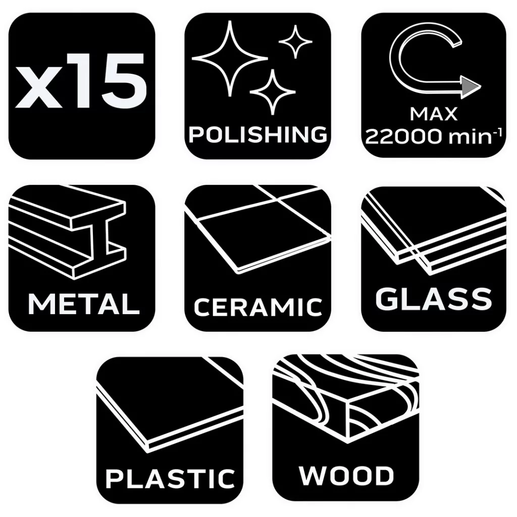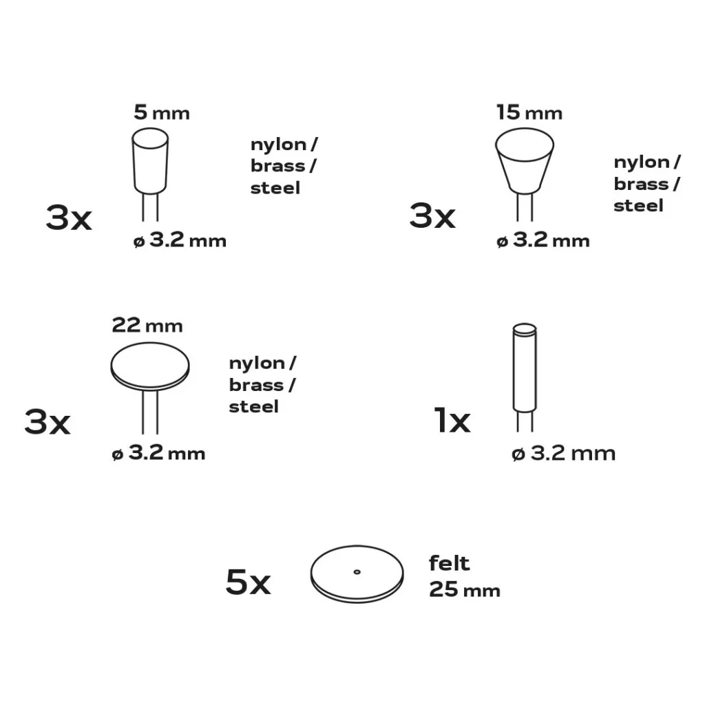 Tartozékkészlet mini multifunkciós géphez NEO TOOLS (cikkszám:. 55-078), a készlet magába foglal 15 db polírozó eszközt. Multifunkciós géppel való használatra javasolt. Alkalmas a legtöbb anyag polírozására, simítására és csiszolására. Alkalmazása: fémek, öntvények, hegesztett kötések, szegecsek, rozsda eltávolítása, kerámia, üveg, fa, műanyag.