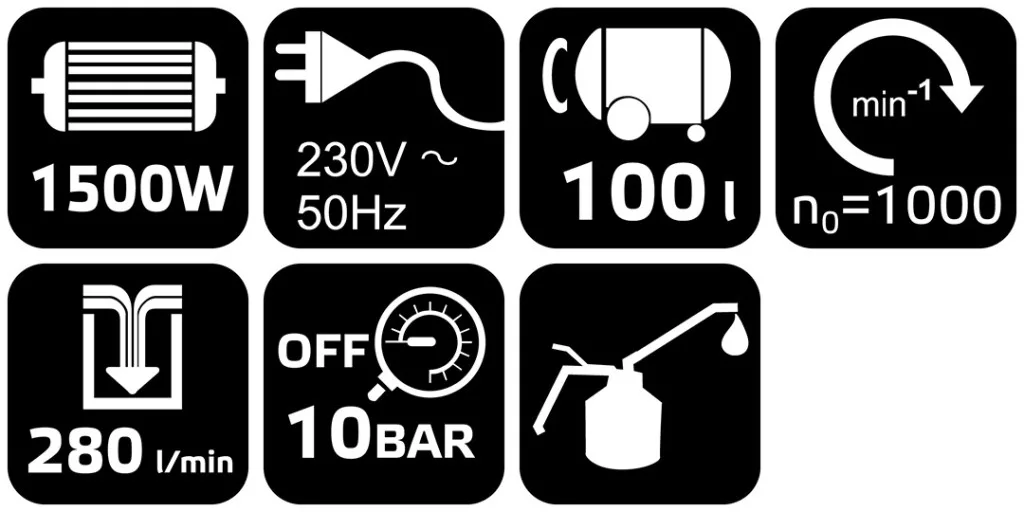 A NEO TOOLS 100 literes, 230 V-os, 12K030-1 típusú olajkompresszor 100 literes űrtartalommal rendelkező, és 1500 wattos teljesítményű olajkompresszor. 230 V/ 50 Hz-es áramellátást igényel. A kompresszor 210 l/perc levegőfelvétellel és 74 dB hangerősséggel rendelkezik. A NEO TOOLS olajkompresszorának méretei 1100 x 400 x 830 mm. Professzionális műhelyek számára ajánlott, ahol nagyon fontos a csatlakozókhoz, a nyomásszabályozáshoz és a manométerekhez való könnyű hozzáférés, valamint a pneumatikus szerszámok széles választékával való munkavégzés képessége. A kényelmes fogantyúnak köszönhetően könnyen szállítható.