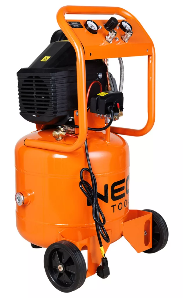 NEO 12K010-1 KOMPRESSZOR, 40L, ÁLLÓ, 8BAR, 169L/MIN, 2 CSATLAKOZÓ, 2 NYOMÁSMÉRŐ, OLAJKENÉSŰ. A kompresszor 169 l/perc beszívott levegőmennyiség, 2850 fordulat/perc maximális fordulatszám, 152 másodperces tartálytöltési idő és 97 dB hangerő jellemzi. Függőleges kialakításának köszönhetően a kompresszor kis helyet foglal, megtartva az ilyen típusú berendezések teljes kapacitását. Professzionális műhelyek számára ajánlott, ahol nagyon fontos a csatlakozókhoz, a nyomásszabályozáshoz és a nyomásmérőkhöz való könnyű hozzáférés, valamint a pneumatikus szerszámok széles választékával való munkavégzés lehetősége. A kényelmes fogantyúnak köszönhetően könnyen mozgatható.