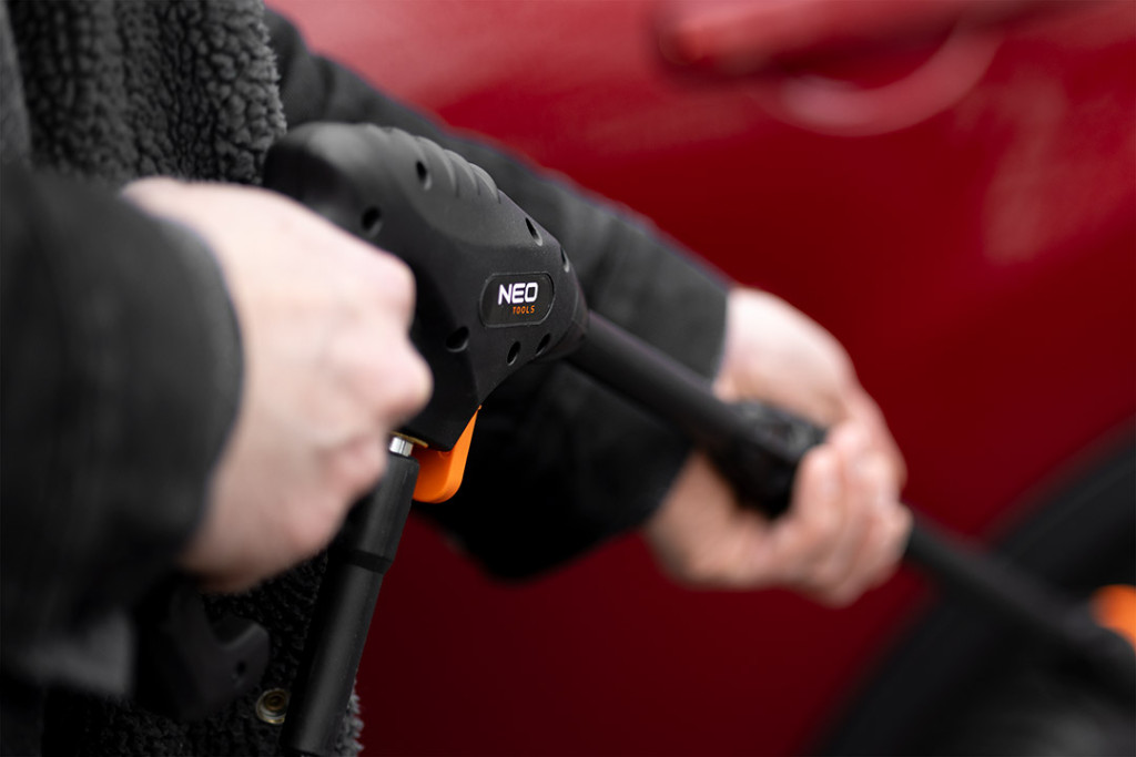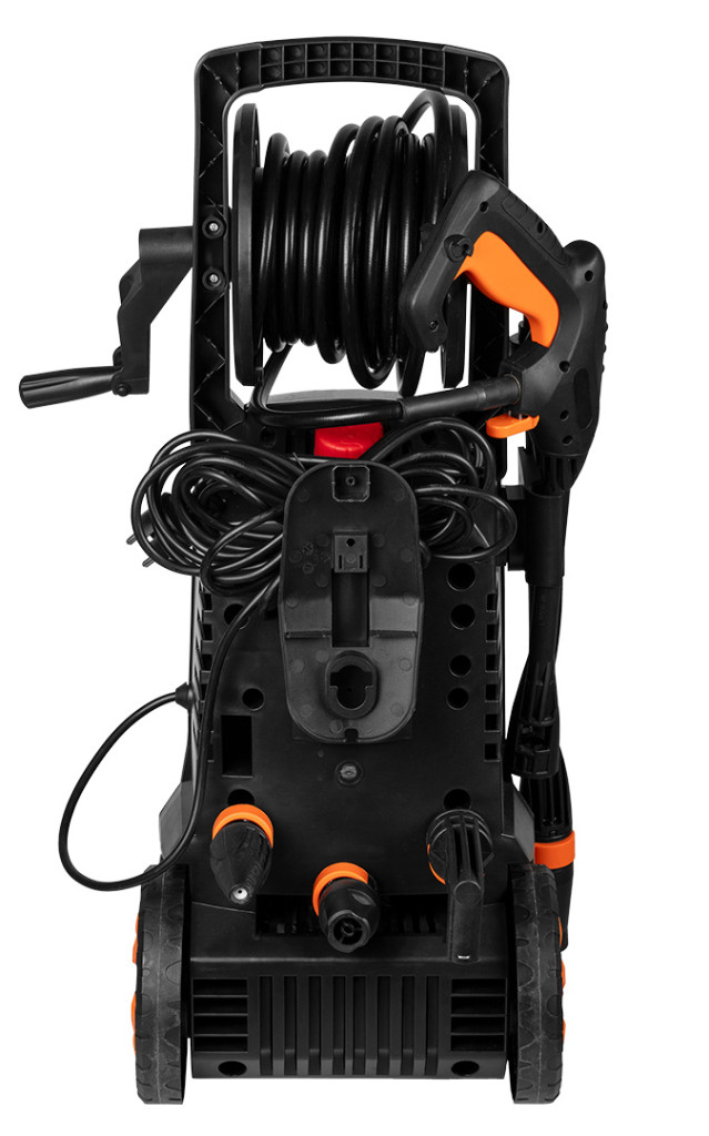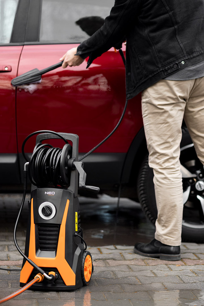 A NEO TOOLS 2200 W 165 Bar 04-631 magasnyomású mosógép 2200 W teljesítményű és 165 Bar maximális nyomással rendelkező magasnyomású mosógép. Teljesítménye 438 l/h, maximális vízhozama 7,3 l/perc. A legmagasabb támogatott tápvíz-hőmérséklet 60°C. A NEO TOOLS magasnyomású mosó alumínium szivattyúval, nagynyomású tömlővel és a hatékony tárolást biztosító tömlődobdal van felszerelve. A hosszú nyomótömlőnek (8 m) köszönhetően könnyű és kényelmes kezelést tesz lehetővé. Különösen alkalmas különböző felületek tisztítására és mosására. Az automatikus leállító rendszer, a beépített habosító berendezés, a terasz tisztítási funkció és a tartozéktároló funkció növeli a NEO TOOLS mosógép kényelmét. A tartozékoknak köszönhetően (a 04-630-as modellel is kompatibilis) a készülék számos alkalmazásban hasznosnak bizonyul. A készlet a következő csúcsokat tartalmazza: turbó, állítható fúvóka, 90 fokos szög, habtisztító csúcs, kefe és terasz tisztító kefe. A NEO TOOLS márkájú mosógép professzionális és háztartási használatra egyaránt ajánlott.