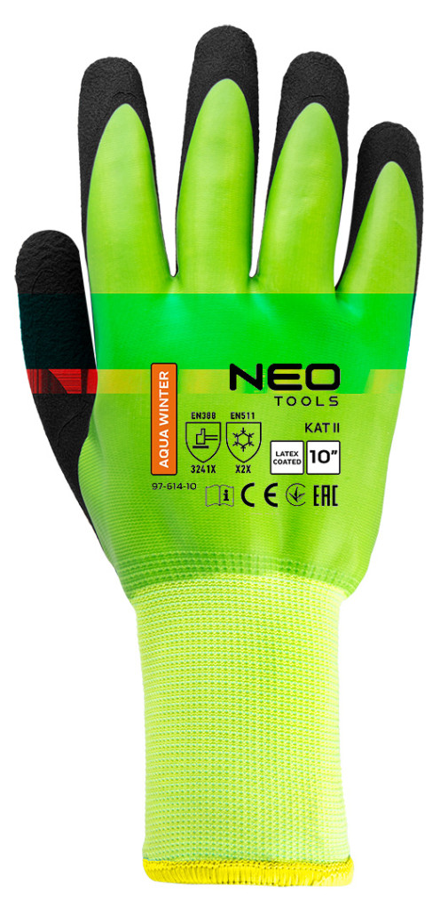 NEO 97-614 Munkakesztyű, AquaWinter, hőszigetelt, vízálló, dupla latex bevonatú poliészter. A NEO TOOLS márkájú kesztyűk dupla latex bevonattal rendelkeznek (sima + hab) és a II, 3241X, X2X kategóriába tartoznak. Az EN388, EN420 és EN511 szabványok szerint tanúsítottak, jellemző rájuk a kopásállóság (3 a 0-tól 4-ig terjedő skálán), az éles tárgyakkal való vágásállóság (2 a 0-tól 5-ig terjedő skálán), a szakadásállóság (4 a 0-tól 4-ig terjedő skálán), a szúrásállóság (1 a 0-tól 4-ig terjedő skálán) és az EN ISO 13997 X szabvány szerinti vágásállóság. A NEO TOOLS AquaWinter munkakesztyűk ellenállnak a hideggel való érintkezésnek, és a víz behatolásának is. Jól illeszkednek a kézre, és a durva textúrájú latexréteg habos felületének köszönhetően biztos fogást és korlátozott csúszást biztosítanak. Ezek a NEO TOOLS vízálló munkakesztyűk a téli hónapok elengedhetetlen kellékei.