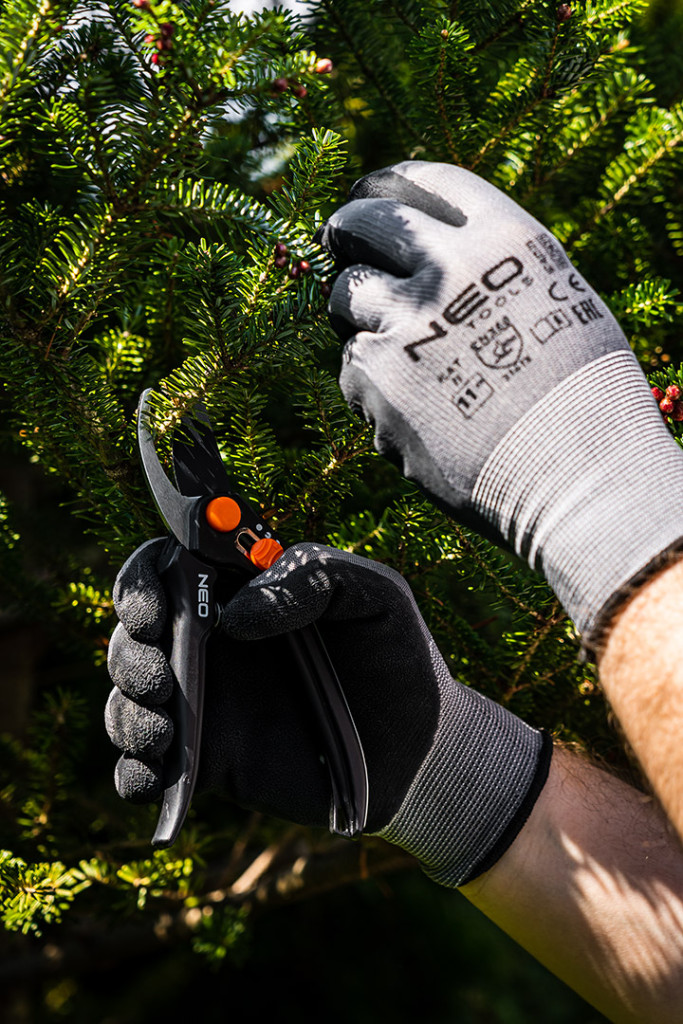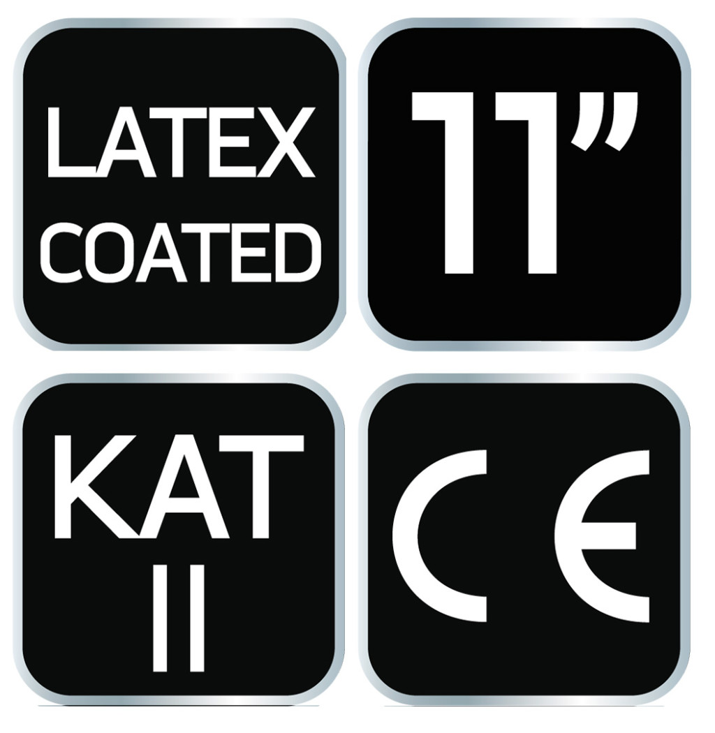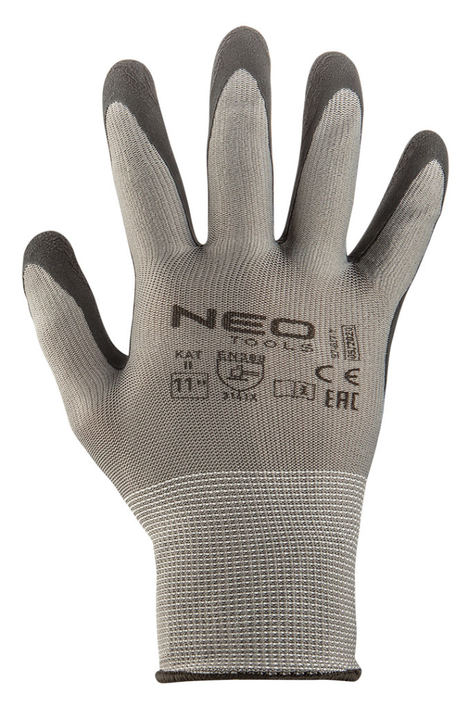 Munkakesztyű, latex bevonatú poliészter (hab), 3141X, 11-es méret, 97-617-11 a NEO TOOLS-tól. Kopásállóságuk 3 (0-tól 4-ig terjedő skálán), éles tárgyakkal való vágásállóságuk 1 (0-tól 5-ig terjedő skálán), szakadásállóságuk 4 (0-tól 4-ig terjedő skálán), szúrásállóságuk 1 (0-tól 4-ig terjedő skálán) és az EN ISO 13997 X szabvány szerinti vágásállóságuk. Jól illeszkedik a kézbe. Mindenféle szállítás, kezelés, tárolás, raktározás, összeszerelési munka, kis alkatrészgyártás, barkácsolás, gépjárműipar és kertészkedés során használják. CE tanúsítvánnyal rendelkeznek az EN 388 szabvány szerint, és más méretekben is kaphatók.