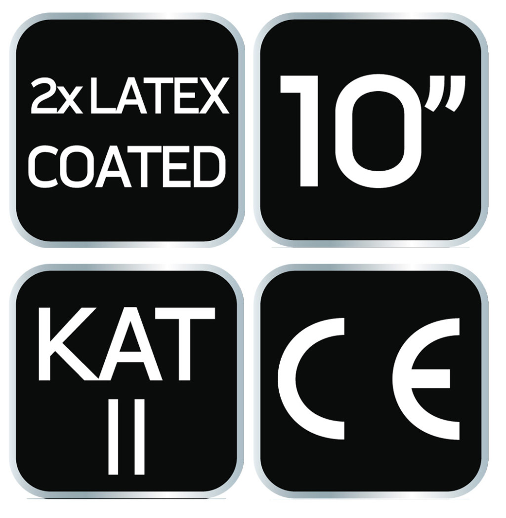 A NEO munkakesztyű védi a kezét a szennyeződésektől, karcolásoktól és a munka közbeni káros hatásoktól. Kettős latexréteggel borított poliészterből készült. Használat közben kényelmet biztosítanak, lehetővé teszik a szilárd fogást, még a kisebb tárgyaknál is, ugyanakkor megakadályozzák, hogy a szerszámok kicsússzanak a kezéből. A CE-jelölés biztonsági garancia, amely bizonyítja, hogy a termék megfelel az összes uniós követelménynek. Méretekben kapható: 8", 9", 10".