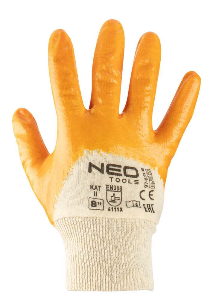 A NEO munkakesztyű védi a kezét a szennyeződésektől, karcolásoktól és a munka közbeni káros hatásoktól. Pamut flanelből készült, nitril borítással. Használat közben kényelmet biztosítanak, magabiztos fogást tesznek lehetővé, még a kisebb tárgyak esetében is, ugyanakkor megakadályozzák, hogy a szerszámok kicsússzanak a kezéből. A CE-jelölés biztonsági garancia arra, hogy a termék megfelel az összes uniós követelménynek. Méretekben kapható: 8", 9", 10".