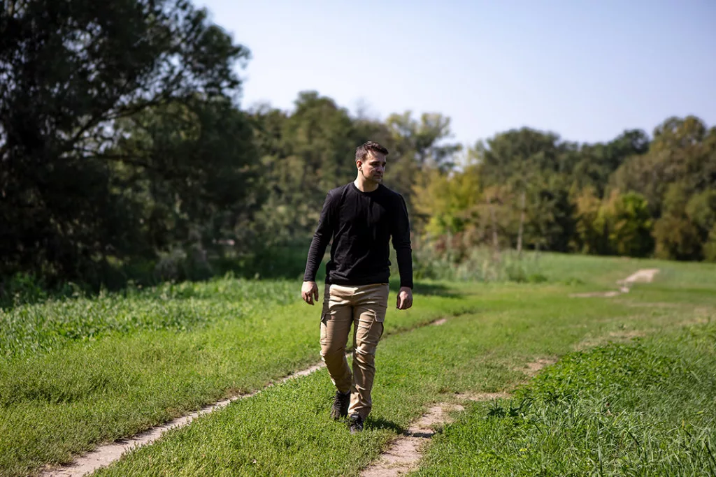 NEO Munkásnadrág, OUTDOOR, bézs, 280g/m2. Egy bézs színű nadrág, amelyet 80% pamut, 17% poliészter és 3% spandex dobby szövésű anyag jellemez. Súlya 280 g/m2. A derékrészen elasztikus pánttal és kiegészítő húzózsinórral van ellátva. Elöl nincs rögzítés. A NEO TOOLS nadrág oldalsó zsebekkel és további cipzáras combzsebekkel, valamint térd fölött térdzsebekkel rendelkezik. A profilozott térd elöl és hátul nagyobb kényelmet biztosít. A lábszár alján a külső oldalon elasztikus mandzsetta garantálja a mozgásszabadságot. Másrészt a két cipzáras foltos zseb további tárolási lehetőséget biztosít. A térd fölötti zsebtapaszon nyomtatott logó, valamint a jobb személyre szabhatóság érdekében névtábla található. Az OUTDOOR jogger típusú munkanadrág a NEO TOOLS egyedi, saját tervezésű nadrágja.
