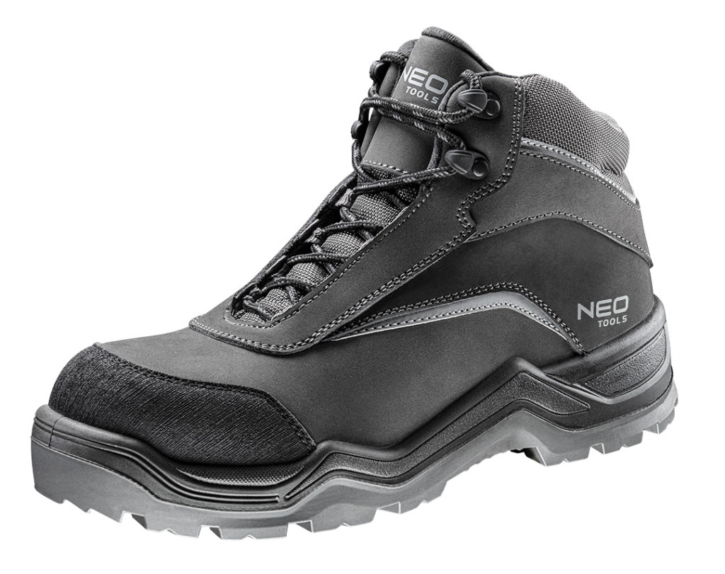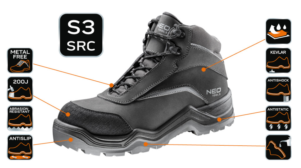 NEO S3 nubuk bőr munkabakancs védi a lábat a hideg és a víz átázása ellen. A lábbeli nagyon kényelmes, nem tartalmaz fémelemeket, ami a bakancsot könnyebbé teszi emiatt a fémdetektorok nem észlelik. Jellemzői: rezgéscsillapító csúszásmentes talp, kopásálló, átszúrás elleni védelem. A munkabakancs számos megerősítéssel és kopásvédelemmel ellátott. CE tanúsítvánnyal rendelkezik, megfelel az EN:ISO 20345:2011 szabványnak.
