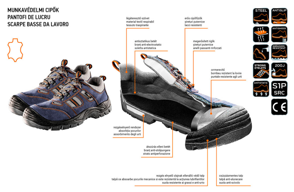 A NEO munkavédelmi cipő alapvető védőeszköz a munkavégzéshez. A felsőrész kiváló minőségű hasított bőrből készül. A lélegző textilbetétek jó szellőzést biztosítanak. A rezgéselnyelő rendszerrel ellátott csúszásmentes talp gondoskodik a kényelemről és a biztonságról. Az átszúrás ellen védő fém betét és a megerősített fém orrmerevítő véd a sérülések ellen. A lábbeli belső részének kialakítása magas fokú kényelmet biztosít a munkavégzés során. A CE jelölés a biztonság garanciája, bizonyítja, hogy a termék teljesít minden európai uniós követelményt. A NEO márka a professzionális igényeket is kielégíti.
