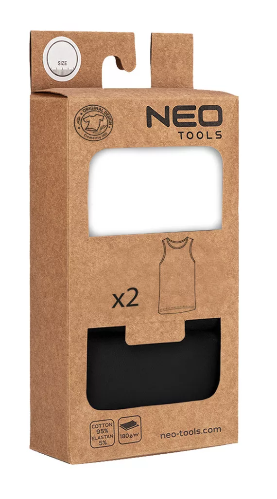 NEO 81-677-L Munkavédelmi póló, fekete-fehér, ujjatlan, 95%pamut, 5%elasztán, 2db/cs. Két pólóból álló szett, fekete és fehér praktikus színekben. A kényelmes viseletű, 180 g/m2 súlyú, egyrétegű kötött anyagból (95% pamut, 5% elasztán) készült pólók téli hónapokban alsó ruházatként és magas hőmérsékletre alkalmas nyári ruházatként egyaránt jól használhatóak. A NEO TOOLS pólók a márka egyedi, saját tervezésű sorozatának részét képezik. Kerek nyakkivágással, hónalj- és nyakkivágási szegéllyel, valamint a belső oldalra nyomtatott címkével rendelkeznek. Sokoldalú ruházati opciót jelentenek a mindennapi viselethez. A pólókra jellemző, hogy megfelelnek a CE minősítésnek.