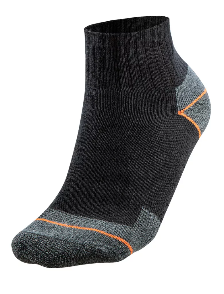 NEO munkazokni kiváló minőségű pamutból készül, poliészterel és elasztánnal, továbbá akrillal amely biztosítja a kényelmet és a higiéniát a munka során. A lábujjakon és a sarkakon megerősített, ez védelmet biztosít a gyors kopás ellen. Fekete színben narancssárga és szürke betétekkel.
