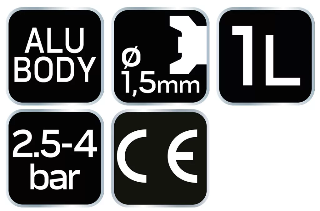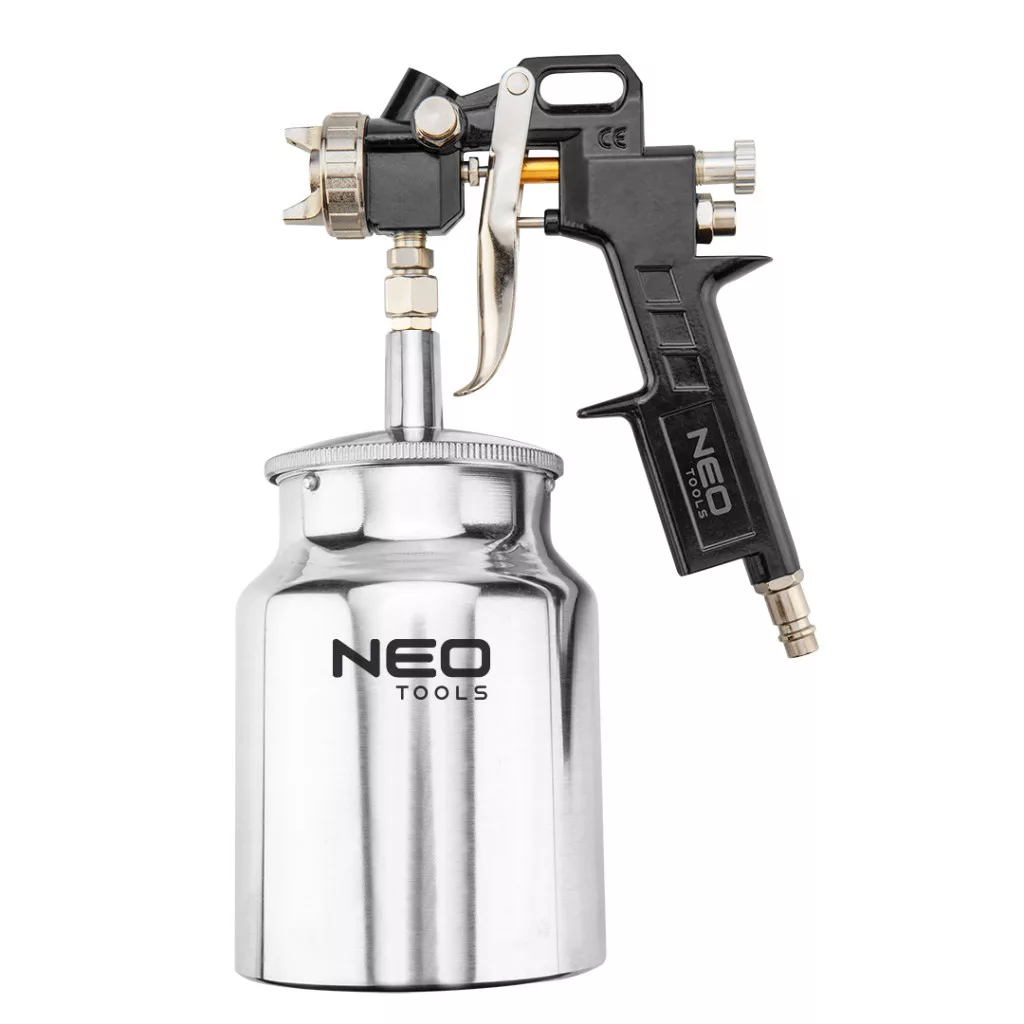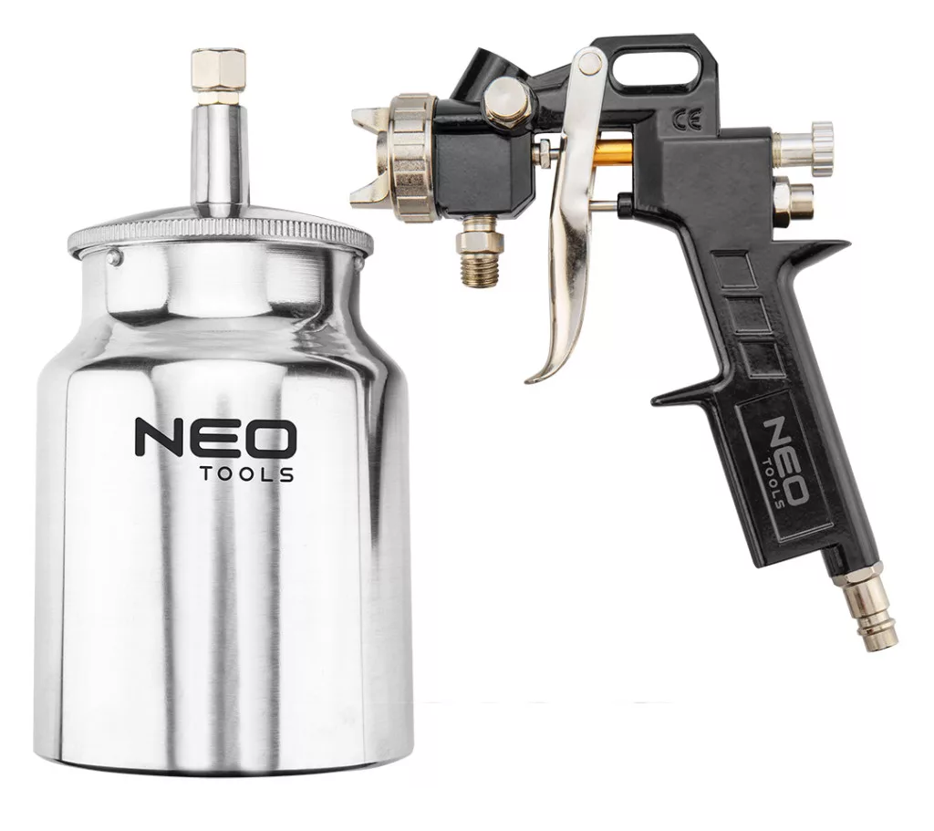 NEO alsó tartályos festékszóró pisztoly 1 literes acél tartállyal. Rozsdamentes acélból készült 1,5 mm átmérőjű fúvókával. Hatékony, pontos munka végezhető vele. Üzemi nyomása 4 bar. A CE tanúsítvány igazolja az európai biztonsági normáknak való megfelelést. A NEO márka a professzionális igényeket is kielégíti.
