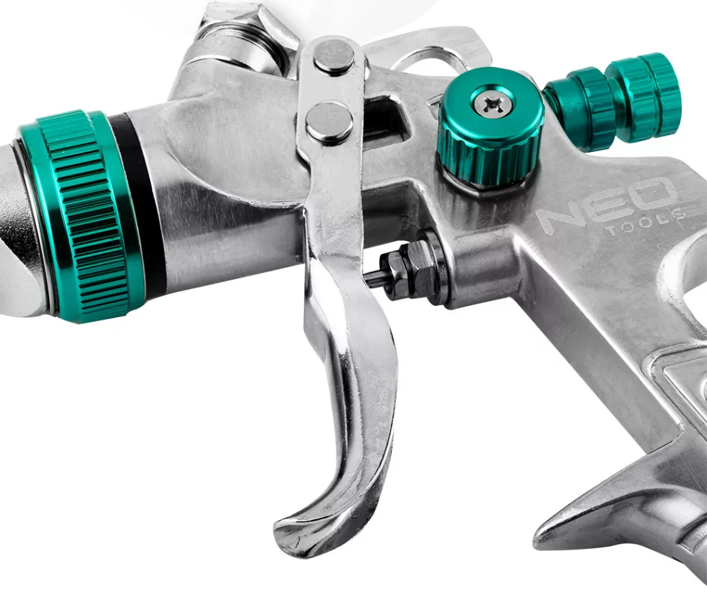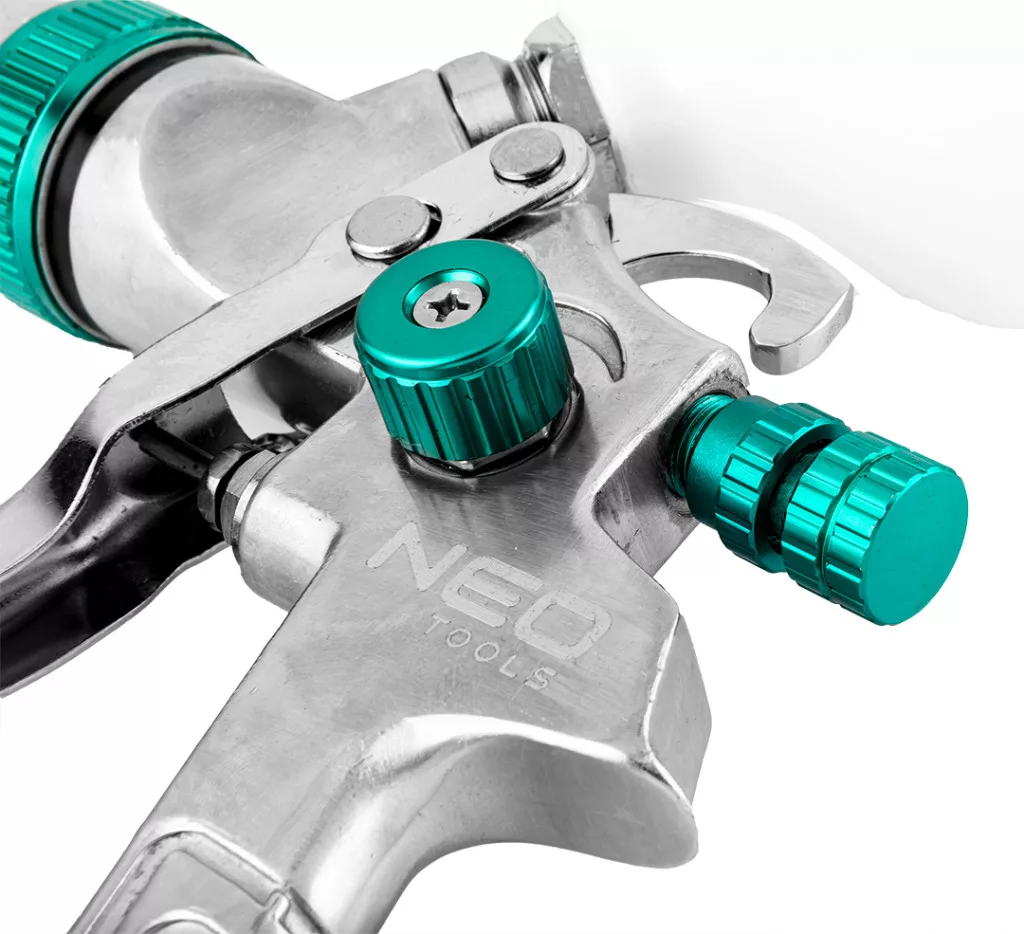 NEO felső tartályos festékszóró pisztoly 0,6 literes tartállyal. A HVLP típusú levegőtakarékos szórópisztoly nagy teljesítményt nyújt kis légnyomáson, ami alacsonyabb festékfelhasználással jár. Fúvókája 1,4 mm átmérőjű. A nyomás három tartományban szabályozható. Ezzel a szórópisztoly teljesítménye hozzáigazítható a festékfajtához és a felülethez. Hatékony, pontos munka végezhető vele. Maximális üzemi nyomása 4 bar. A CE tanúsítvány igazolja az európai biztonsági normáknak való megfelelést. A NEO márka a professzionális igényeket is kielégíti.