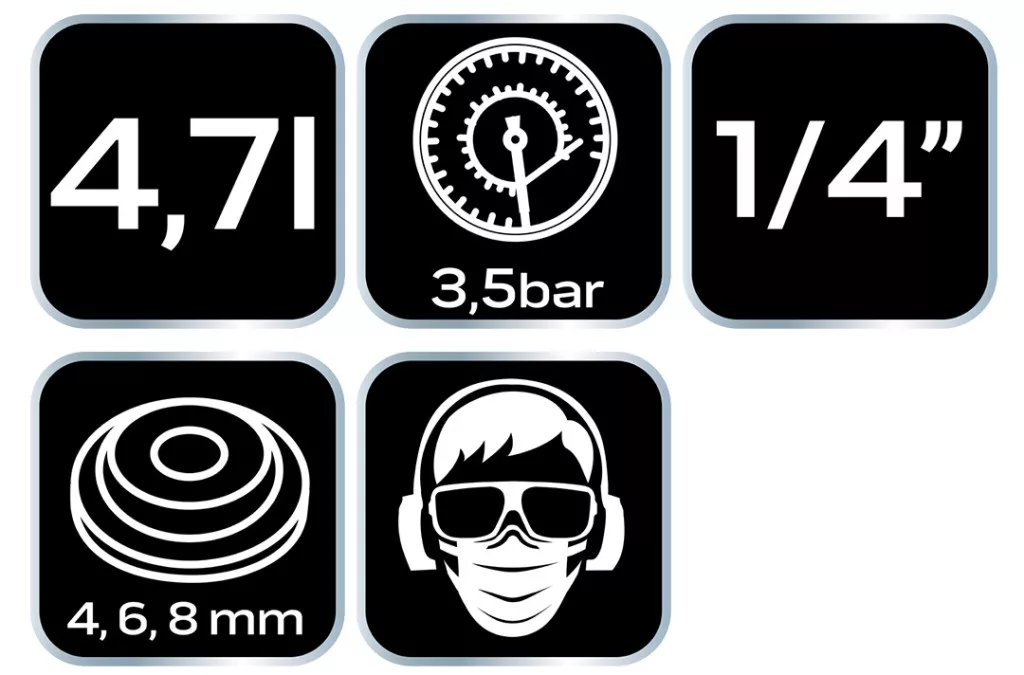 NEO felső tartályos festékszóró pisztoly strukturális festékekhez 6 literes műanyag tartállyal. A készletben 4, 6 és 8 mm-es fúvókával a különféle festékekkel végzett munkákhoz. Hatékony, pontos munka végezhető vele. Üzemi nyomása 3,5 bar. A CE tanúsítvány igazolja az európai biztonsági normáknak való megfelelést. A NEO márka ezermestereknek készül.Szórópisztoly strukturális festékekhez, 6 literes tartály, üzemi nyomás 3,5 bar, tartozékként fúvókák: 4 mm, 6 mm, 8 mm
