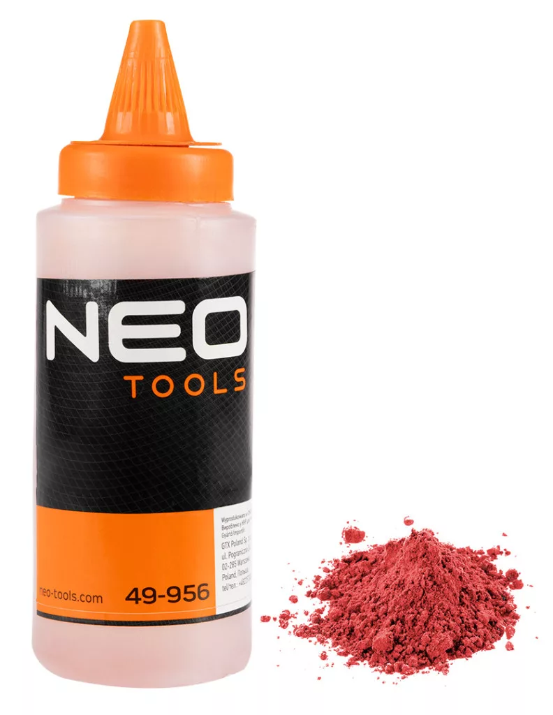 NEO 49-956 PORFESTÉK, 115G, PIROS. Porfesték kicsapózsinórokhoz felületek jelölésére. Jellemzője a 115 g-os súly. Minden építőipari szakmunkás felszerelésében nélkülözhetetlen.