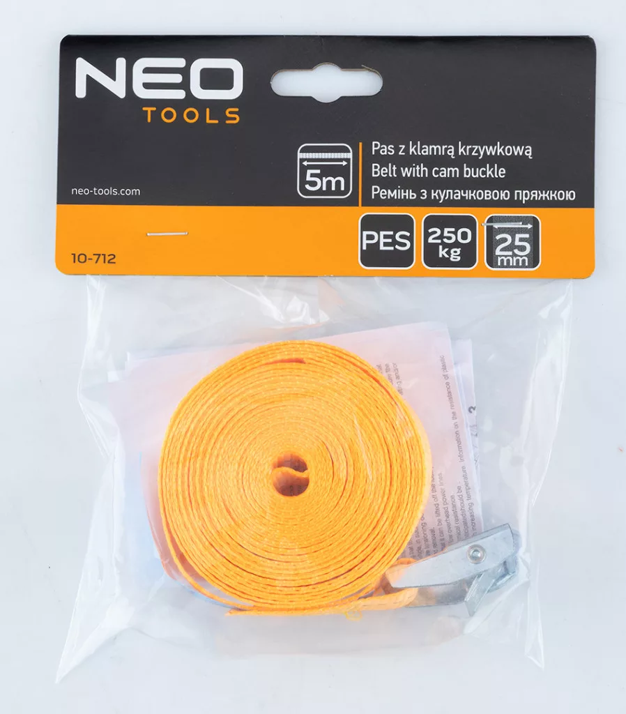 NEO 10-712 Rakományrögzítő heveder 5m/25mm, 2db/cs. Egy robusztus heveder a rakományok szállításához és tárolásához, amely egy rögzítőcsattal van ellátva. Jellemzője a 25 mm szélesség és az 5 m hosszúság. Tartós PES anyagból készül. Teherbírása akár 250 kg/darab. A NEO TOOLS márkájú rögzítőheveder 2db-os szettben kapható.