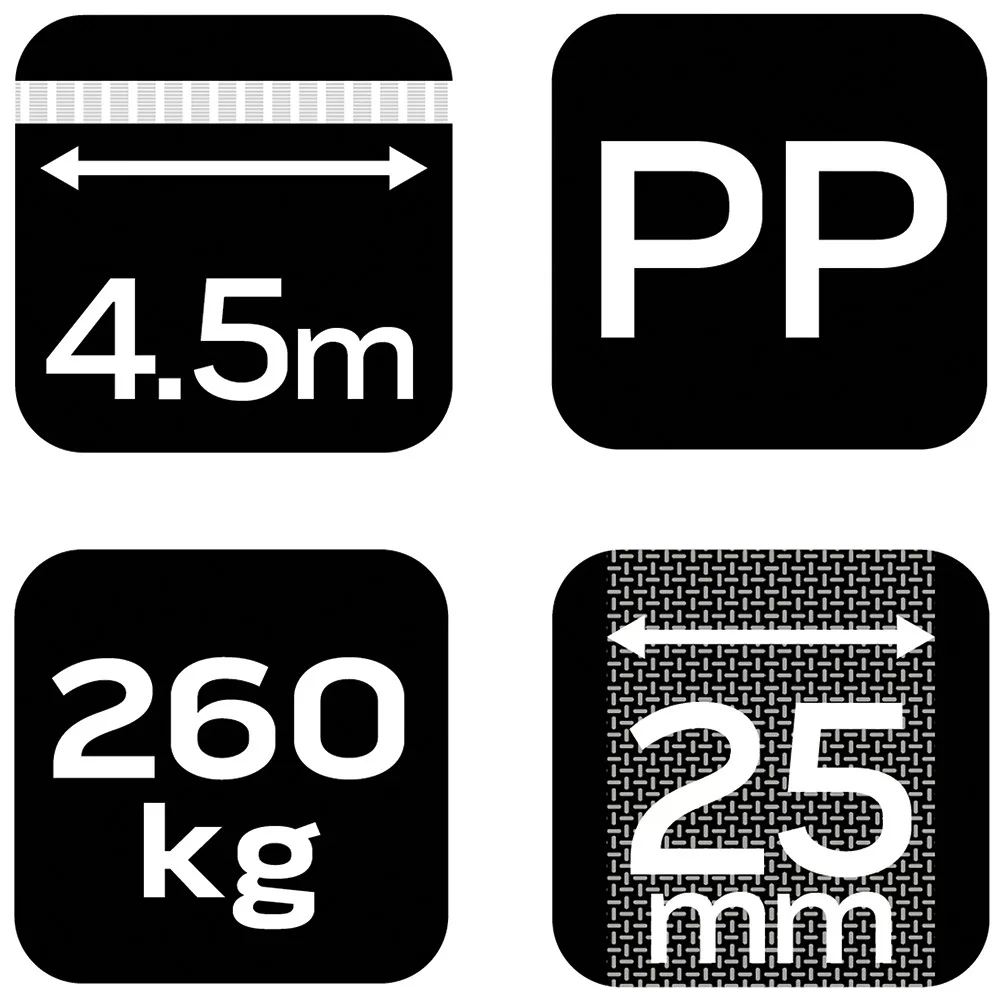 NEO 10-703 Rakományrögzítő racsnis heveder 4,5m/25mm, 260kg. A rakományok szállítás vagy tárolás közbeni rögzítésére alkalmas. Teherbírása 260 kg-ig terjed. A NEO TOOLS által gyártott rakományrögzítő robusztus racsnis feszítőretesszel van felszerelve. PP anyagból készül. Ez egy tanúsított termék, amelyet barkács és professzionális használatra is ajánlunk.