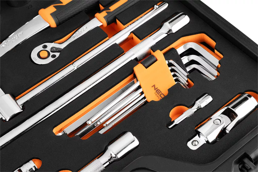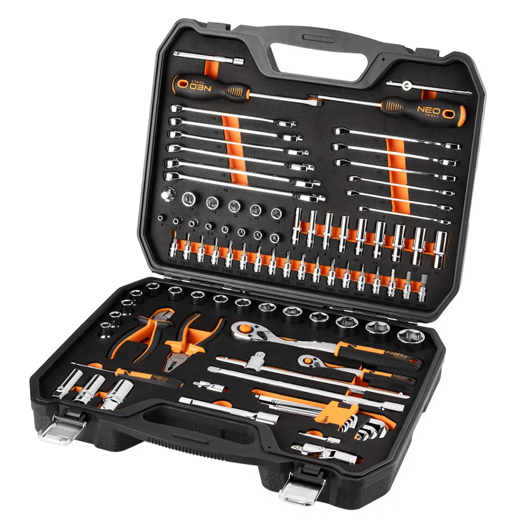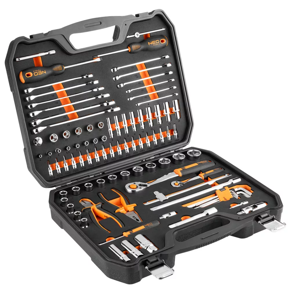 Neo Tools Szerszám és dugókulcs készlet, 1/4", 1/2", EVA habszivacs, műanyag koffer, 96db
