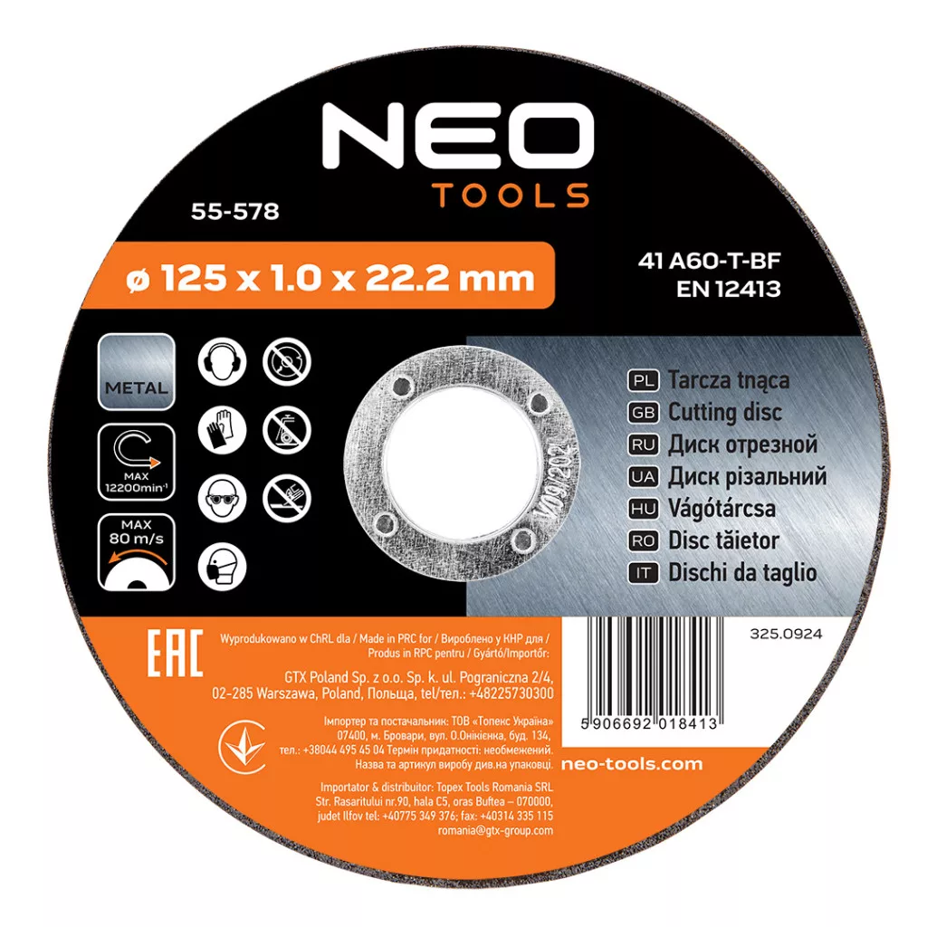NEO TOOLS 55-578 vágókorong fémhez, 125 x 1,0 x 22,2 mm, 41 A60-T-BF 10 db/cs. A terméket fém vágására tervezték. Innovatív kialakításának és vastagságcsökkentésének köszönhetően lehetővé teszi a munkaidő jelentős csökkentését. Magas szintű biztonságot biztosít az EN12313 szabványnak való megfelelésnek köszönhetően. A NEO TOOLS márkájú korongokat a szakemberek és a barkácsolás szerelmesei számára ajánljuk.