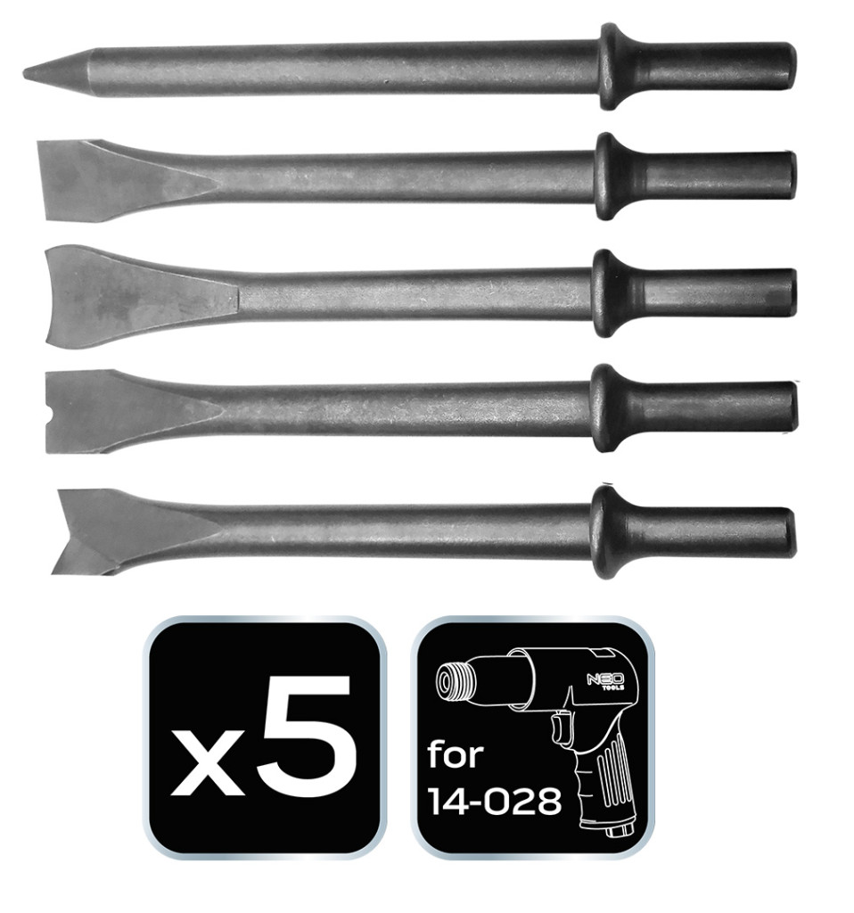 Vésőkészlet 14-028 pneumatikus vésőkalapácshoz. 5 darabos. Eredeti NEO tartozékok. A NEO márka a professzionális igényeket is kielégíti.