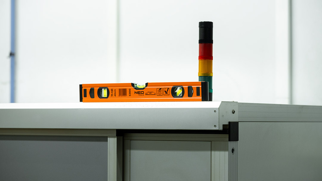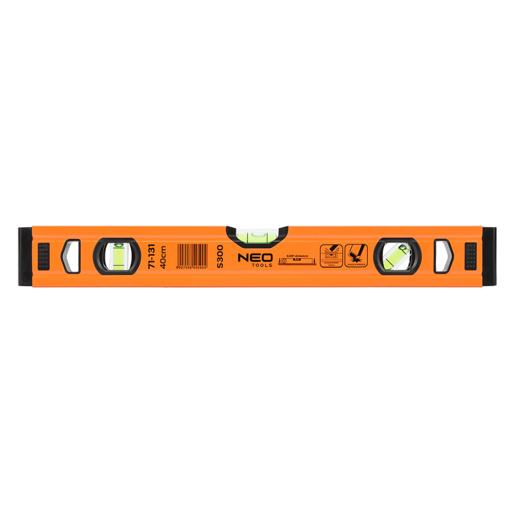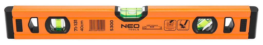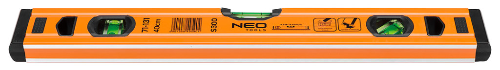 Az S 300 alumínium vízmérték, a NEO-tól egy csúcskategóriás szintező 3 libellával (45, 90 és 180 fok). A kínált modell 51,5x20,5x400 mm-es méretekkel rendelkezik. Profilvastagsága 1 mm, sűrűsége pedig 0,395 kg/m. A libellák pontossága 0,029°=0,5 mm/m. A szerszám alumíniumból készült. A szerkezet 2 ütésgátló végdugóval van ellátva. Szakembereknek és barkácsolóknak ajánlott.
