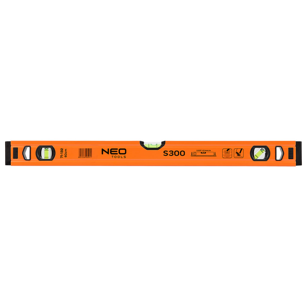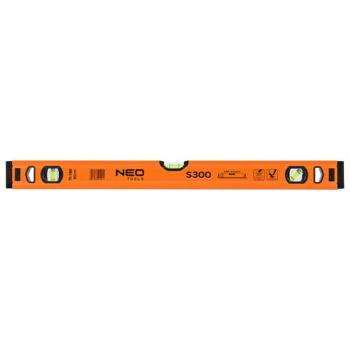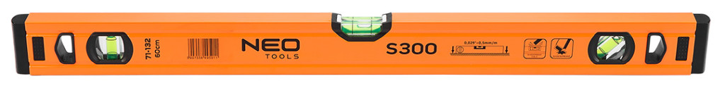 Az S 300 alumínium vízmérték, a NEO-tól egy csúcskategóriás szintező 3 libellával (45, 90 és 180 fok). A kínált modell 51,5x20,5x600 mm-es méretekkel rendelkezik. Profilvastagsága 1 mm, sűrűsége pedig 0,395 kg/m. A libellák pontossága 0,029°=0,5 mm/m. A szerszám alumíniumból készült. A szerkezet 2 ütésgátló végdugóval van ellátva. Szakembereknek és barkácsolóknak ajánlott.