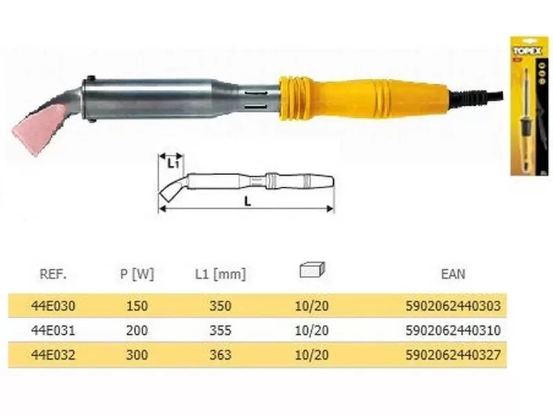TOPEX elektromos forrasztópáka, üzemi hőmérséklete 410 ºC. Fémelemek összeforrasztására szolgál alacsony olvadáspontú forrasztóanyaggal, pl. cink-ólom ötvözettel (lágyforrasz). Alkalmazásra talál szerelésnél, bádogos és tetőfedő munkákban. Elsősorban lemezek forrasztására használatos, de használják jelölésre, vinilek vágására. A CE tanúsítvány igazolja az európai biztonsági normáknak való megfelelést. A TOPEX márka ezermestereknek készül.Elektromos forrasztópáka, 200W áramellátás: 230 V 50 Hz, CE tanúsítvány