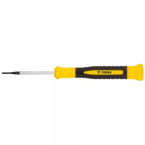 A TOPEX Torx műszerész csavarhúzó kiválóan beválik szerelési, barkácsolási munkákban. Hegye nagy ellenállóképességű, a szerszámnak hosszú élettartamot biztosító króm-vanádium acélból készült. Az edzett acélból készülő mágneses hegy megkönnyíti a szerszámmal végzett munkát A forgó feltétje funkcionalitását bővíti, lehetővé teszi a szerszám pontosabb vezetését. Az ergonómikus, csúszásmentes anyaggal bevont műanyag markolat biztosítja a kényelmet és a biztonságot a munkavégzés során. A TOPEX márka ezermestereknek készül.