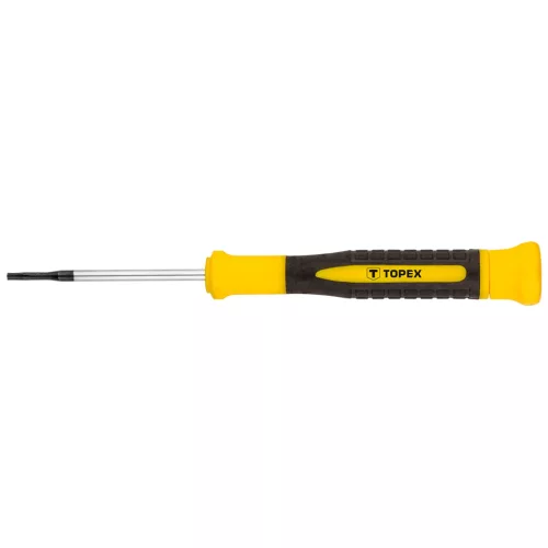 A TOPEX Torx műszerész csavarhúzó kiválóan beválik szerelési, barkácsolási munkákban. Hegye nagy ellenállóképességű, a szerszámnak hosszú élettartamot biztosító króm-vanádium acélból készült. Az edzett acélból készülő mágneses hegy megkönnyíti a szerszámmal végzett munkát A forgó feltétje funkcionalitását bővíti, lehetővé teszi a szerszám pontosabb vezetését. Az ergonómikus, csúszásmentes anyaggal bevont műanyag markolat biztosítja a kényelmet és a biztonságot a munkavégzés során. A TOPEX márka ezermestereknek készül.