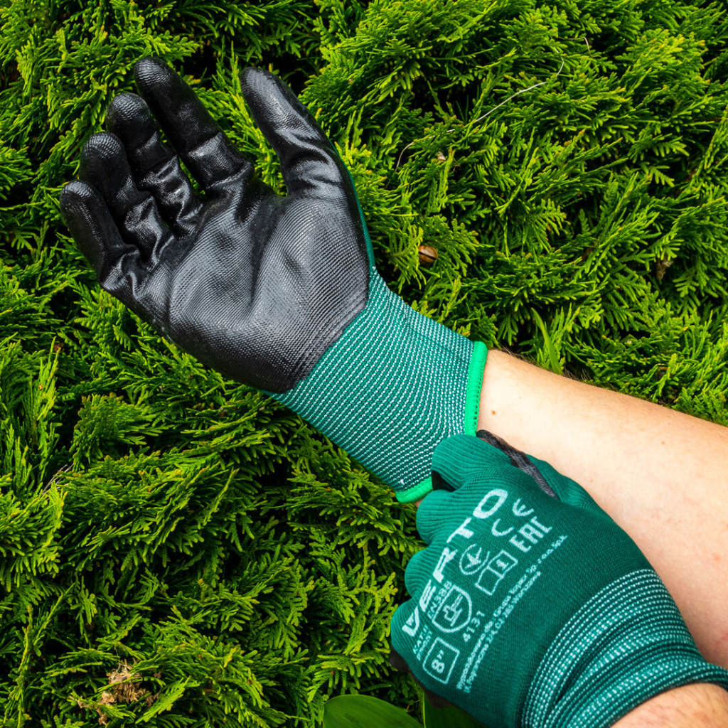 VERTO univerzális kerti kesztyű rugalmas, nitrillel bevont, légáteresztő anyagból készül. A nitril bevonat növeli a szerszámokhoz és az anyagokhoz való tapadást. Teljesen folyadékszigetelt, valamint ellenáll a olaj, zsír, benzin és kőolaj származékok hatásának. A kesztyű fokozottan ellenáll a vágásnak és az átszúrásnak, valamint kimagaslóan erős dörzsölés tűrő, szakadásálló képességgel rendelkezik. Ideálisan illeszkedik a kézhez, ezért kiválóan alkalmas a precíz munkák végzésére. Méretválasztk:8",9",10"