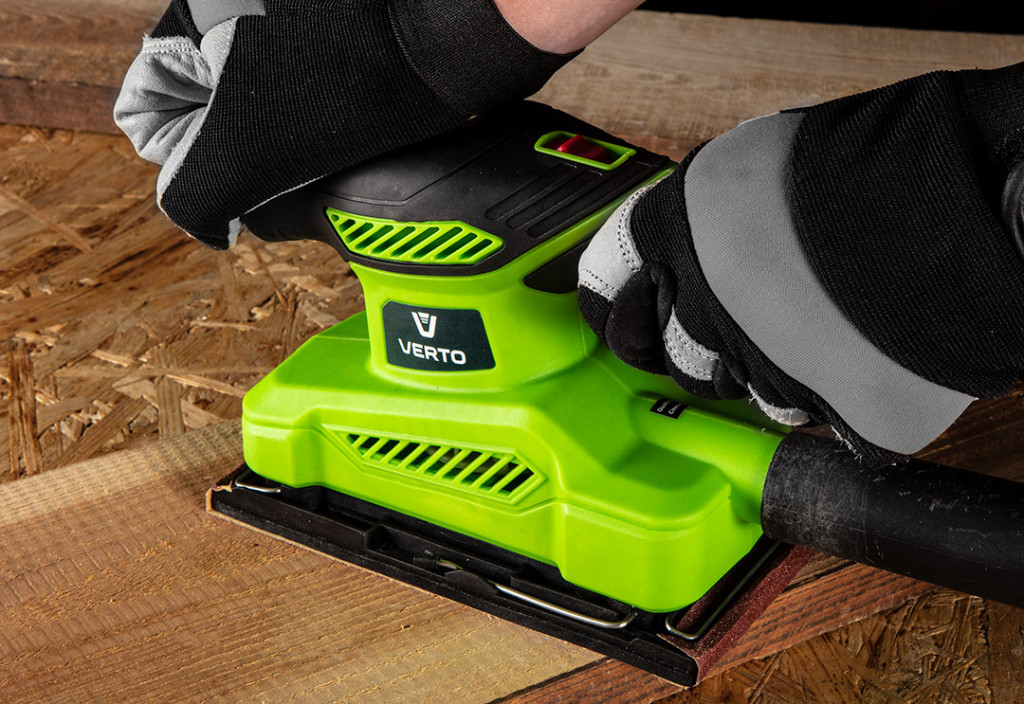 VERTO rezgőcsiszoló. 150 W, 90 x 187 mm-es talp. max rezgésszám 12 000 perc-¹, rezgési amplitúdó 0.75mm. A csiszológéphez csiszolópapírt (93 x 230 mm) és tartalék szénkeféket adunk. A gép súlya 1,28 kg. Ezt a csiszolómodellt csúszásmentes, kényelmesen használható fogantyú, porelszívó rendszer és a folyamatos működést biztosító kapcsolózár jellemzi. Nélkülözhetetlen eszköz a csiszoláshoz, polírozáshoz és a rozsda vagy festék hatékony eltávolításához.