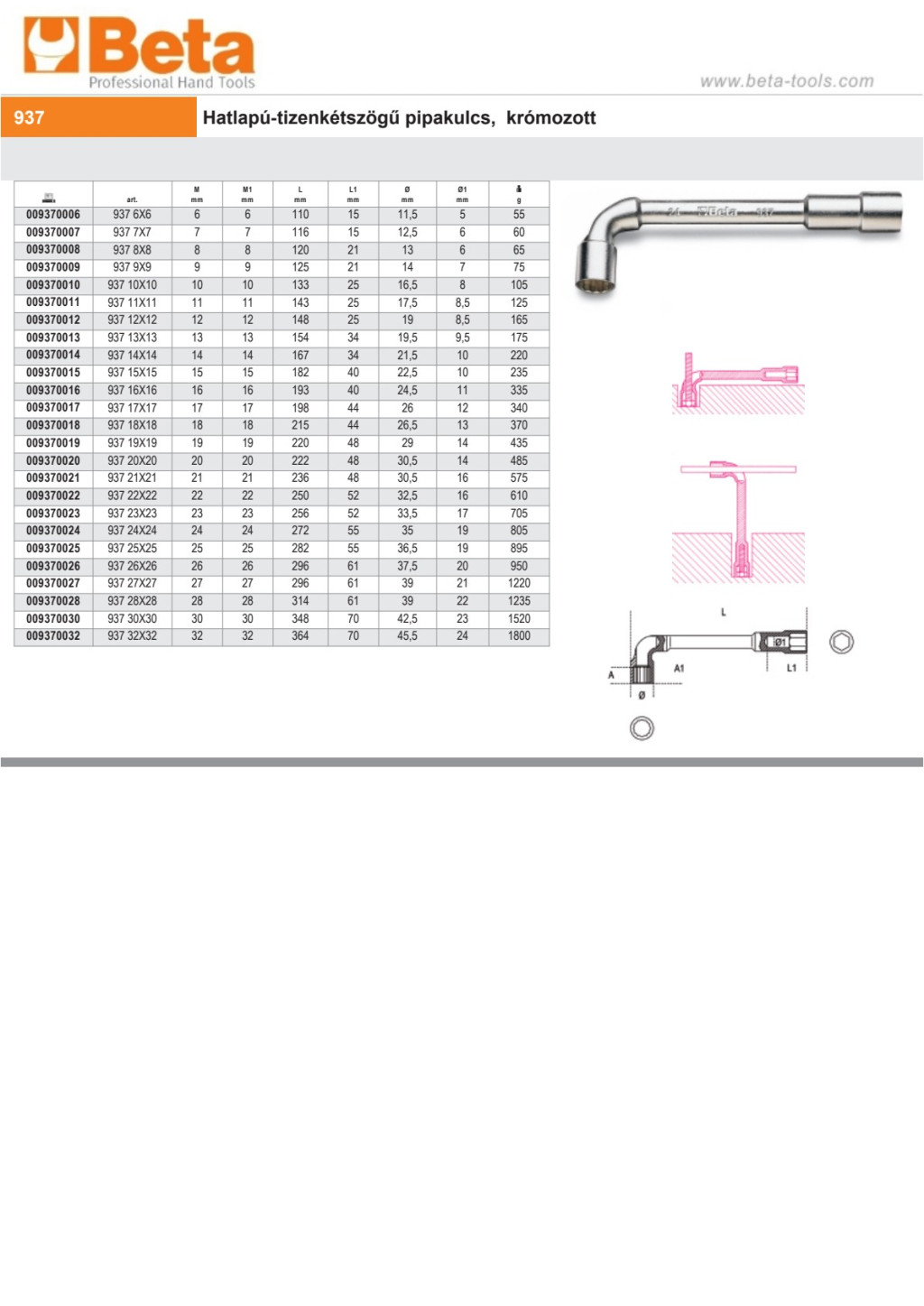 Beta 937 Hatlapú-tizenkétszögű pipakulcs, krómozott 9mm