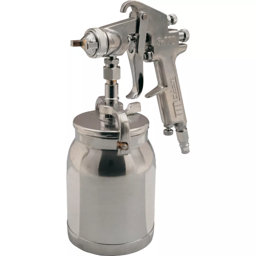 Standard Jól kiegyensúlyozott kivitel nagyméretű érzékeny működtetőkar és állítható szórásszélesség Alkalmas vízszintes vagy függőleges használatra cellulóz zománc vagy akril festékekkel stb 1 4 NPT külső menetes csatlakozó 30-70 psi 2-4 5bar 7-12 cfm 250-430 l min Gyorscsatlakozós alumínium tartály 1 000 cm3 A standard típus alapozó bevonatok felhordására alkalmas Súly 1 3kg